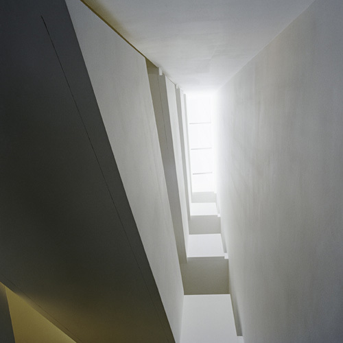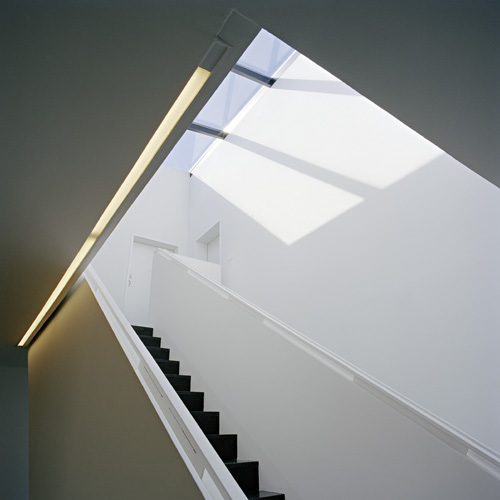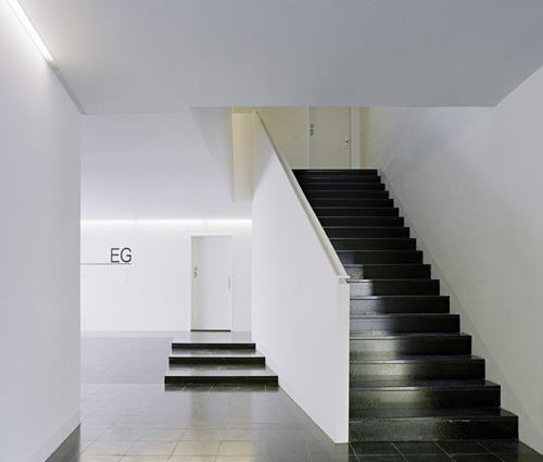 Das Ergeschoss ist etwas zurückversetzt, wodurch sich eine überdachte Eingangszone ergibt. Das Foyer bietet Durchgangsmöglichkeit von der Straße zum Garten und ist im Hinblick auf seine Ausstattung keineswegs mit dem Eingangsbereich eines herkömmlichen Wohnbau zu vergleichen. Schwarzer Terrazzoboden und weiße Wände, in die die unterschiedlich großen rechteckigen Fensteröffnungen mit ihren schwarzen Rahmen an Mondrian Gemälde erinnern, bestimmen den ersten Eindruck. Auch die Stiegen bekleiden schwarze Terrazzoplatten, rahmenlose Glasbrüstungen säumen den Abgang zum Keller, Richtung Obergeschosse tritt ein interessantes Spiel aus etwas schiefwinkelig versetzten Treppenläufen und Geländern zu Tage, das immer wieder neue Raumeindrücke beim Hinaufsteigen erleben lässt. Mit der gekonnt eingesetzten Mischung aus dezent positionierter Beleutung und natürlicher Belichtung von oben, grafisch extravaganter Beschriftung der Stockwerke und raffinierten Details, wie etwa besonders gestalteten Handläufen, zeigen die Architekten, wie auch ein „bloßes Stiegenhaus“ zu einem architektonisch wervollen Raum werden kann und den Gesamteindruck des Gebäudes schon bei dessen Betreten würdevoll repräsentiert. (Text: Marion Kuzmany)
