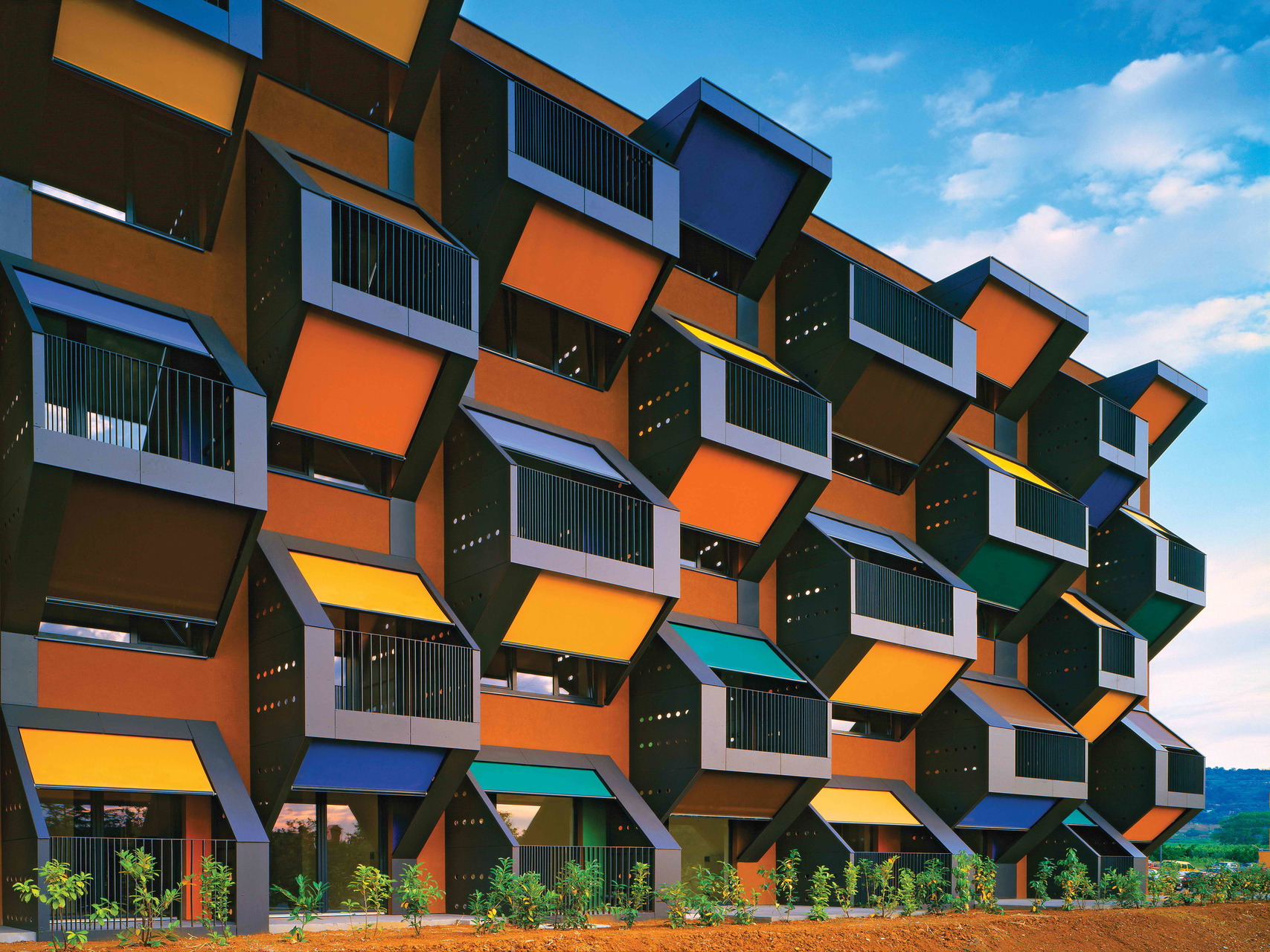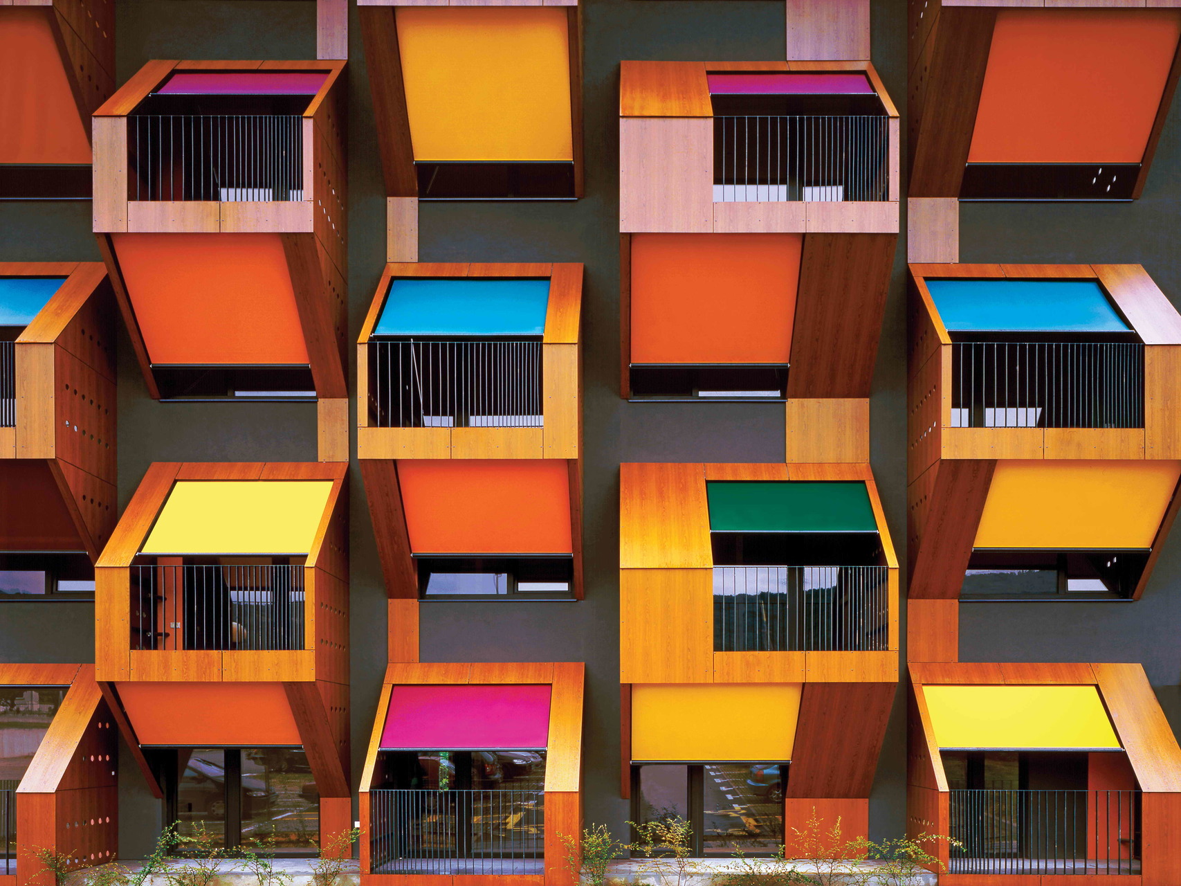 While the Polje social housing was financed by Ljubljana's City Government, the apartment block in Izola is part of the national housing scheme. Since 30 apartments were for sale the budget was extremely tight. The construction costs of the non-profit block were 600 euros per square metre which translated into a 1250 euros per square metre selling price. Rok Oman of Ofis architects conducted a masterly study of the floor plans. A modular scheme was applied within the given contours of the block, resulting in optimum use of space and a maximum net saleable surface area. Collective spaces are reduced to a minimum to keep the square metre price low. After solving the internal layout, Ofis architects turned to the external appearance. The balconies were transformed into semi-closed loggias wrapped in colourful awnings that act as sun shades. This playful optical game transforms the block into an impressive design object, causing controversy among locals and professionals alike.