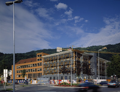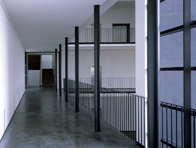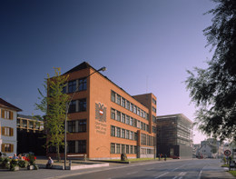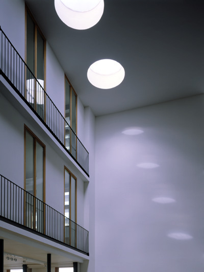 Einen völlig anderen Charakter hat der geschlossene südwestliche Hof, in den man beim Betreten des Gesamtkomplexes zuerst gelangt. Hier dominieren die kräftigen Fassadenraster aus maisgelb eingefärbten Betonfertigteilen, die vor der Verglasungsebene stehen. Eine Sekundärstruktur aus Holzrahmen und Glasflächen entsteht durch die weitere Unterteilung der Rasterfelder in öffenbare, festverglaste und opake Elemente unterschiedlichen Formats. (Text: Architekten)