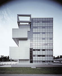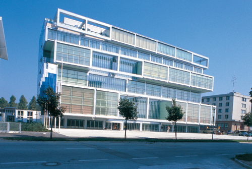 Anders als die auf Interaktion ausgerichtete Vertikalhalle wollen die spektakulären Fassaden des aus zwei unterschiedlichen Hälften bestehenden Hauses dem Unternehmen auch nach aussen hin einen effektvollen Auftritt garantieren: Der aus einer Eisenbetonkonstruktion bestehende, achtstöckige Bürotrakt besitzt eine glatte, nach Freud das «männliche» Prinzip verkörpernde Haut, die die Geschosszahl völlig verunklärt. Die halböffentliche Südseite besteht hingegen aus einem Stahlskelett, das sich zu einem chaotischen Stapel farbiger Kisten formt, wobei deren «weibliche» Auskragungen wohl unbewusst auch eine Reverenz an die Bauten Edvard Ravnikars, des Meisters der slowenischen Nachkriegsmoderne, darstellen.