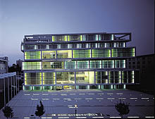 Möglich wurde dieser futuristische Organismus dank einem Kunstgriff: Sadar & Vuga zogen - virtuell - den Sockel unter der gläsernen Scheibe des Bürotrakts hervor, klappten ihn auf und verbanden ihn mit dem nun etwas abgesunkenen Glashaus. Dadurch verkürzen sich im Innern nicht nur die mittels Treppen, Brücken und Raumschluchten dramatisch inszenierten Kommunikationswege. Aus dieser Lösung resultierte auch eine zur Dimiheva-Strasse hin sich öffnende, nachts wie eine Landepiste erhellte Plaza, die zusammen mit dem Neubau den eigentlichen Kondensationskern des schnell sich wandelnden Quartiers mit seinen Ministeriums- und Fakultätsgebäuden bildet.