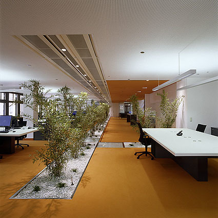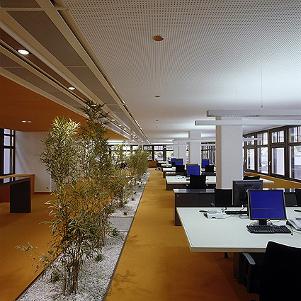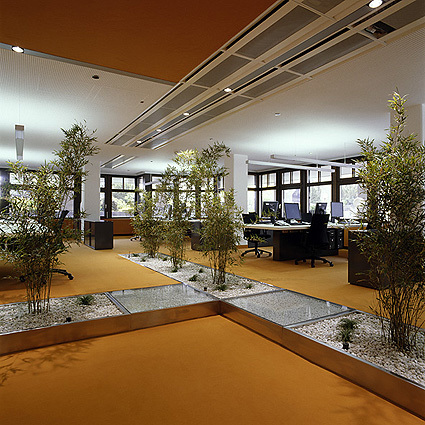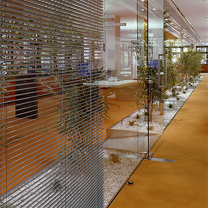 - der zugang zu den einzelnen arbeitsgruppen erfolgt über glasplatten um den ´durchlaufenden gartenähnlichen´ charakter dieser zone nicht zu unterbrechen