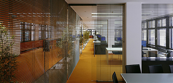 Zugang zu den Arbeitsplätzen in Stützenachse zwischen den Arbeitsgruppen mittels Glasbrücken
