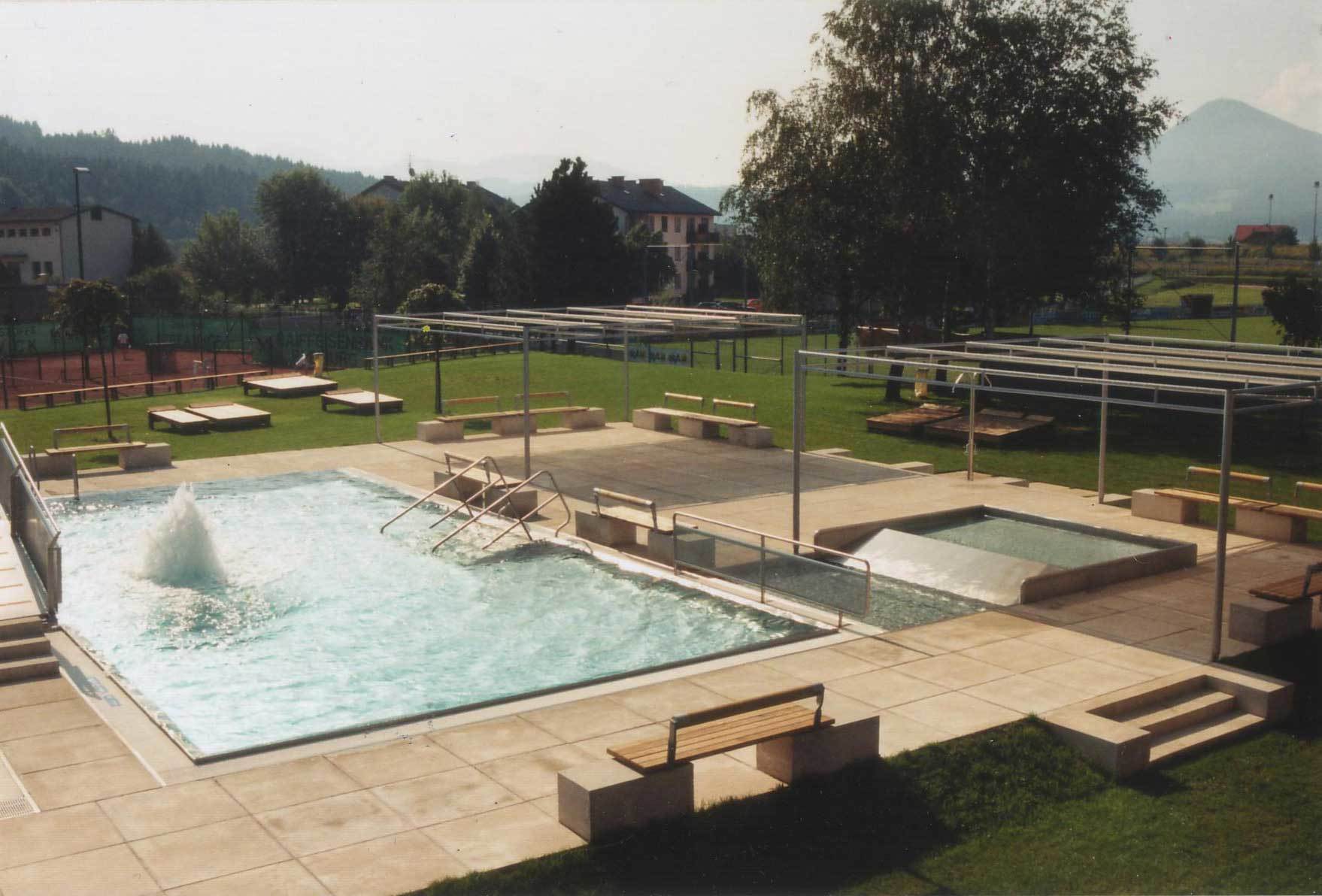Die eingeschossige Ausstellungshalle zwischen der bestehenden Werner-Berg-Galerie und der Stadtmauer aus dem fünfzehnten Jahrhundert ist hingegen ein massiver Block. Die Außenwände bestehen aus Betonfertigteilen, deren Oberfläche mit Dolomitschotter belegt wurde. Quasi eine Waschbetonplatte mit Lokalkolorit, denn der Stein stammt vom Bleiburger Hausberg, der Petzen. Den Übergang zum Altbau bildet ein niedriger Würfel mit Betondecke und zwei großen Glasflächen zum Hof. Statt aber allein auf die Didaktik der trennenden Glasfuge zu setzen, verschleift Fleiß den Übergang mit einer gewundenen Holzwand. Dieses Detail ist typisch für die Arbeitsweise des 1959 geborenen Architekten. Auch das Freibad, neben dem Hauptplatz der einzige wirklich öffentliche Ort Bleiburgs, lebt von solchen Gesten, die gleichermaßen präzise wie lakonisch sind. Fleiß, der mittlerweile im niederösterreichischen Gablitz lebt, ist viel zu bescheiden, um großen Wirbel um seine Arbeit zu machen. Es ist Zeit, Bleiburg auf die Architekturreiserouten zu setzen.