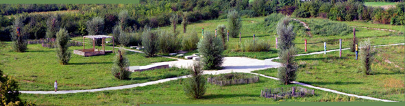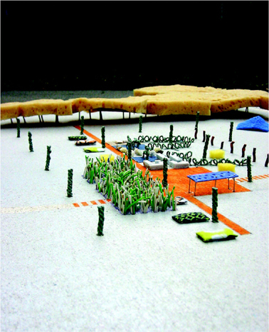 Raster: Die Fläche des Spielplatzes wird von 20 rasterförmig verteilten Säulen markiert, die einen Kontrast zur umgebenden Wiese setzen. Als Säulen werden lebendige Weidenfaschinen verwendet, ihr stetiges Wachsen verändert den Charakter des Rasters.