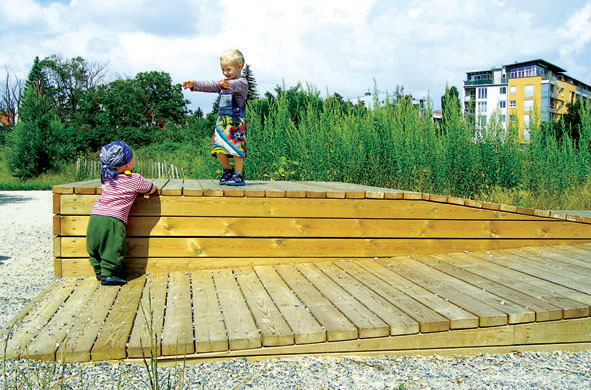 Spielfelder: Im Gegensatz zum starren Rahmen des Rasters stehen einzelne Themenspielfelder miteinander in Bezug und überschneiden sich teilweise. Eingesetzte robuste Materialien und Bodenmodellierungen sind aufeinander abgestimmt: 100 m Bahn, Platz, Weidengräben, Blätterwald, Weidenmonster, Holzpodest, Pflanzbeete, Erdhügel und Wächter:innen verdichten zu einem bespielbaren, bunten Nebeneinander.