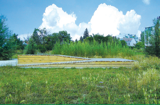 Ein Holzdeck mit Bühnencharakter und unterschiedlich ausformulierten Seiten und Rampen, lässt neben dem Verweilen auch Bespielung zu. Ein Sandspiel mit Hundehemmschwelle in Form eines erhabenen Stegs, das einem Sprungbrett gleich zum Sandbad einlädt, verwebt sich in einem bunt verflochtenen Pergolendach mit dem Himmel. Noch einmal wurde mit Kindern ein Blätterwald aus Haselnüssen und ein Schmetterlingsbeet gepflanzt.
