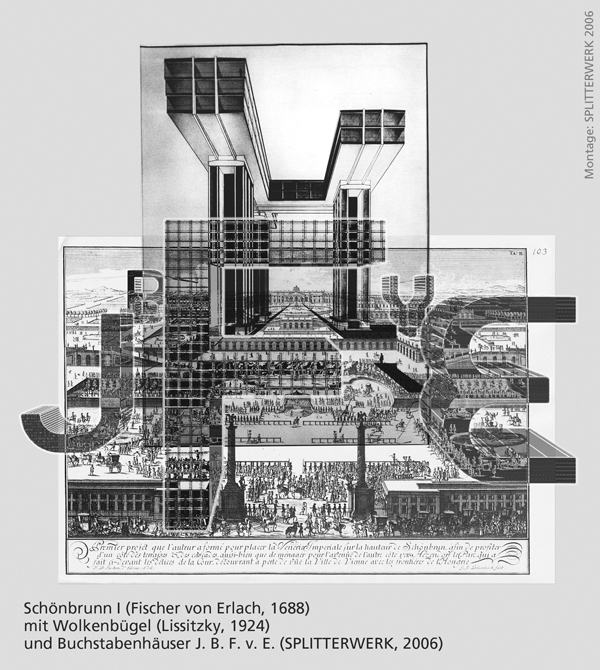 Die von SPLITTERWERK gestaltete Ausstellung „JOHANN BERNHARD FISCHER VON ERLACH 1656 – 2006“ über das Werk des in Graz geborenen und 1723 in Wien verstorbenen größten Baumeisters des österreichischen Barock stellt, wie der Direktor des stadtmuseumgraz Otto Hochreiter ausführt, „die Frage nach der heutigen Bedeutung des ungemein innovativen und visionären Bildhauer-Architekten.“Paradigmatisch lässt Splitterwerk im Stiegenhaus und Foyer des ersten Obergeschosses - gleichsam als Annäherung zur Ausstellung - Fischer von Erlach in großformatigen Bildern aus dem zeitlichen Off auf die Frage „Herr Fischer, was wollen Sie uns mit Ihrem Werk ‚Entwurff einer historischen Architectur’ eigentlich sagen?“ mit seiner Vorrede zu diesem Werk antworten: „Daß man durch einige Proben von allerhand Bau-Arten das Auge der Liebhaber zu ergötzen, und denen Künstlern zu Erfindungen Anlaß zu geben, mehr im Sinne gehabt, als die Gelehrten zu unterrichten“.