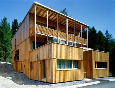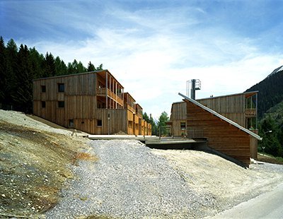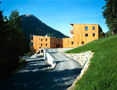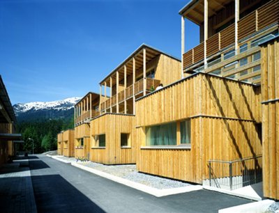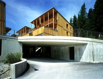 Drittens wurde durch eine intelligente Erschließung (auch über eine Tiefgarage) eine gute Verbindung zu Häusern für extreme klimatische Bedingungen geschaffen. Dabei wurden Umraum und Landschaft optimal geschont und eine Wohnstraße geschaffen, die die Qualität eines Dorfplatzes erhalten wird.