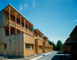 Bauweise: 20 Doppelhäuser (im Endausbau) und Mietswohnhaus mit zentraler Hackschnitzelheizung und Solaranlage (70 m²): Niedrigenergiehäuser, Massivbau mit Holzfassade und Loggien.