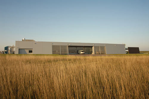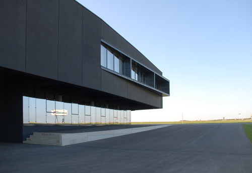 Das Bauwerk gliedert sich in zwei Bereiche, den Bürotrakt und den Entwicklungs- und Produktionsbereich. Der Bürotrakt liegt zur Straße hin orientiert, die Halle schließt direkt an das Flugfeld an. Das Bürogebäude enthält neben den administrativen Funktionen in Zusammenhang mit der Produktion und dem Vertrieb auch die Forschungsabteilung und den Schulungsbereich. Die Konferenzräume sind an eine großzügige Besucherterrasse angeschlossen, die für Flugvorführungen genutzt wird. Die Mitarbeiterbereiche haben einen ebenso hohen Stellenwert wie die halböffentliche Zone bekommen. Die Aufenthaltsbereiche sind großzügig angelegt und hochwertig gestaltet. Der Produktionstrakt beinhaltet eine zweitausend Quadratmeter große Produktionshalle in der mit den modernsten Produktionsverfahren der autonom agierende Hubschraubr „Camcopter S100“ gefertigt wird und in der neben der Herstellung und der Montage von Bauteilen auch ein Bereich für die Entwicklung und Wartung der Hubschrauber untergebracht ist. Der mit dem österreichischen Staatspreis für Design 2005 ausgezeichnete Camcopter wird weltweit vertrieben und ist in seiner innovativen Konzeption einzigartig. (Text: Architekten)