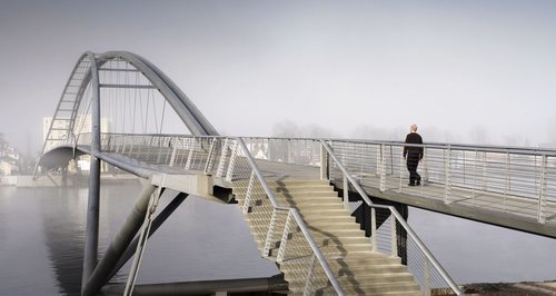 Gewiss ist die Gestaltung eines Fußgänger- und Radfahrerstegs, bei dem die Hauptlasten das Eigengewicht und die Windkräfte sind, einfacher als etwa eine Autobahnbrücke. Aber die 230 Meter Spannweite bedeuten in dieser Kategorie derzeit Weltrekord, und der geringe Bogenstich von 23 Metern war ingenieurtechnisch eine Herausforderung. Bis in die Details reicht die planerische Sorgfalt. So wurden die Durchdringungen der Fahrbahnrandträger mit den Bogen als anspruchsvolle, exakte Stahlgussteile hergestellt, und alle übrigen Gelenke, Stäbe und Kraftanschlüsse sind bewusst, aber nicht verspielt gestaltet.