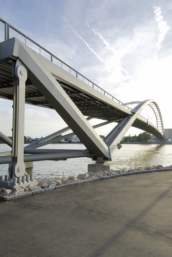 Die Stadt Weil am Rhein als Vertreterin der Bauherrschaft, der „Communauté des Trois Frontières“, war daher gut beraten, als sie 2001 einen Wettbewerb ausschrieb, den die Arbeitsgemeinschaft Feichtinger Architectes, Paris und Leonhardt, Andrä und Partner, Berlin gewann. Knappe 200 Meter unterhalb des politischen Einflussbereichs der Basler Stararchitekten schlug das Siegerteam eine elegante Stahlbogenbrücke vor, die mit einer einzigen Öffnung von 230 Metern den Rhein überspannt. Die Fahrbahnplatte dient als Zugband, sodass außer den Windlasten nur senkrechte Auflagerkräfte zu bewältigen sind. Um die Sicht auf den historischen Turm am Hauptplatz von Huningue nicht zu verstellen, verläuft die Brücke an der Nordseite der beiden neu verbundenen Straßenräume - eine städtebauliche Sensibilität, die heute nicht selbstverständlich ist. Zudem weist sie ein asymmetrisches Tragwerkskonzept auf: Der nördliche Bogen ist erkennbar kräftiger und besteht aus zwei Sechseckrohren. Der südliche, ein Rundrohr, neigt sich Ersterem zu, sodass die Blickachse zwischen den benachbarten Orten offen bleibt. Die gute Nachbarschaft Frankreichs und Deutschlands sowie die städtebauliche Einbindung bilden den Symbolgehalt des nicht bloß funktionalen, sondern wohlproportionierten und eleganten Bauwerks.