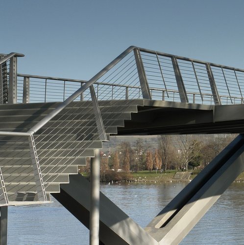 Elegant, städtebaulich sensibel, und ein Weltrekord: die 230 Meter weite Rad- und Fußgängerbrücke über den Rhein. Ein Werk der Auslandsösterreicher Dietmar Feichtinger und Wolfgang Strobl.