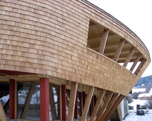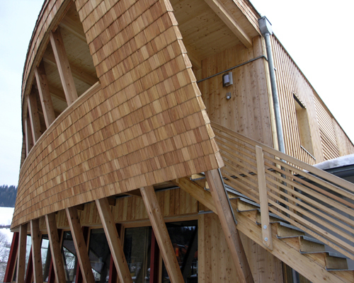 Um eine einheitliches, Erscheinungsbild und einen sanften Übergang zwischen den verschieden geformten Hüllkurven zu erreichen, wurden als Oberflächendeckung unbehandelte Lärchenschindeln verwendet. Das Gebäude wird durch einfache gestalterische Mittel zum Blickfang und inszeniert sich von der anliegenden 82 m langen Abbundhalle als eigenständiger Gebäudeteil.