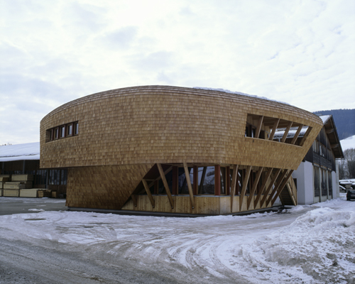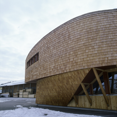 Leimholz-Stangenware aus variierenden Längen bildet die Konstruktion, und formulieren einen Gebäudetypus, der aus jedem Blickwinkel unterschiedlich und nach subjektivem Erfordernis sowohl zum bestehenden Betrieb und als auch zur Umgebung Stellung nimmt. Die traditionellen Baustoffe sind jedoch neuartig interpretiert, die Schindeldeckung verweist auf das örtlich traditionell stark ausgeprägte Handwerk in der Region und das Potential von bestehendem Know-how für zukunftsbezogene Technologien.