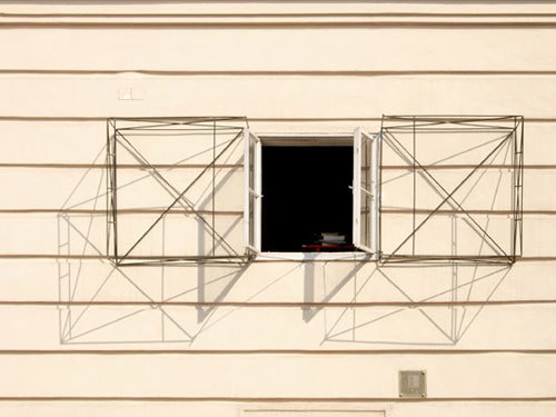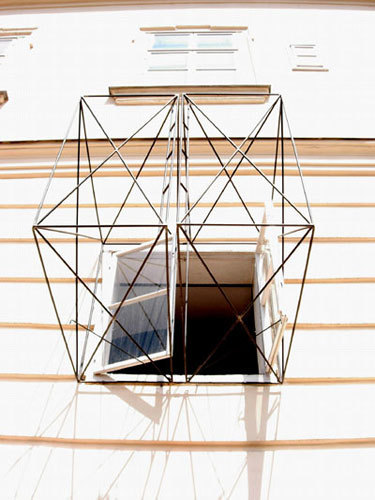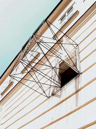 Wie 3-dimensionale Fensterläden sind die beiden Würfelhälften der zweigeteilten Konstruktion aus rohem Rundstahl vor dem Bürofenster des forum experimentelle architektur (f.e.a.) befestigt. Der den Innenraum erweiternde f.e.a.-Würfel ist ein würfelförmiger Leerraum, eine filigrane, kubische Konstruktion, flexibel mit wechselnder Erscheinungsform und spannendem Schattenwurf. Die Konstruktion kann im Sommer hier, auf der südseitigen Fassade, Schatten spenden. Vorausgesetzt, die aktuelle Bespielung beinhaltet Planen oder Folien, mit denen der Würfel dann eingekleidet ist.