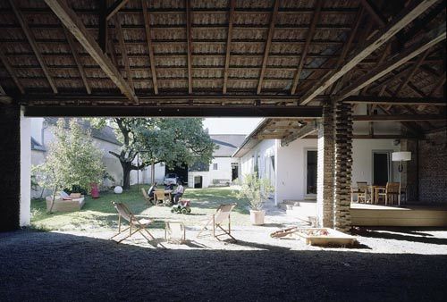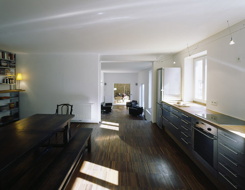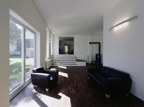 Die Strategie war klar: möglichst viel Erhaltenswertes nutzen und wenige, effektive Eingriffe setzen. Im Keller ist nun die gesamte Heiztechnik untergebracht, das Dach ist für spätere Zeiten zum Ausbau gerüstet, zu ebener Erde lebt man schon jetzt hochkomfortabel: Das wachgeküsste Wohnpotenzial der einstigen Traktorwerkstatt ließ den Bestand zur ausgedehnten Raumflucht anwachsen, die erst auf der Terrasse unterm Scheunendach am Hof endet.