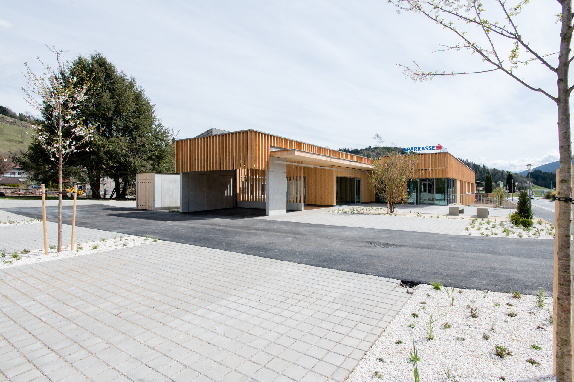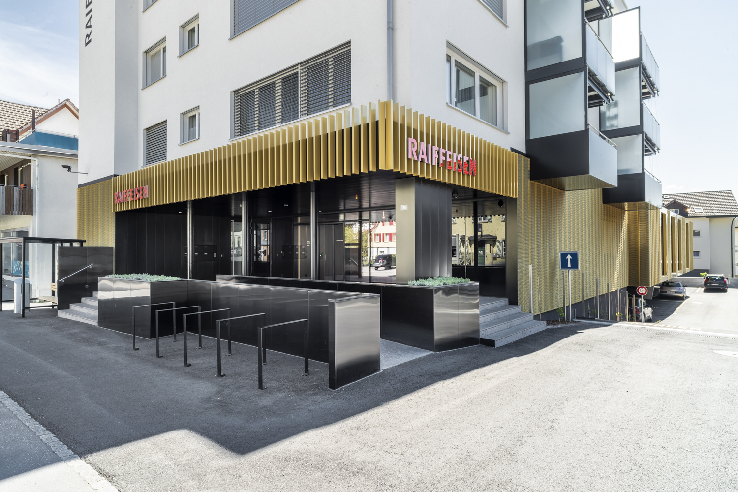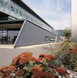 Der Turm steht seitlich neben der mit großem Aufwand restaurierten Markthalle. Sie wurde durch Einbauten in ein Konferenzzentrum verwandelt und bildet auch den Hauptzugang zum Gebäude. Hier entsteht tatsächliche eine Collage zwischen Alt und Neu: Ein horizontaler Trakt durchschneidet die Halle schräg und verfällt dabei in eine heftige Krümmung, die sich über den Eingang schiebt. Dahinter entwickelt sich eine gut rhythmisierte Raumfolge, die schließlich in das erste, unterste Atrium des Turms führt. Frei zugänglich ist nur ein kleiner Teil des Areals, dessen Außenanlagen von Günther Vogt gestaltet wurden. Das Konferenzzentrum ist ein zumindest halböffentlicher Bereich, hinter dem dann die Hochsicherheitszone des Turms beginnt.