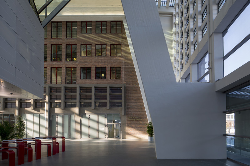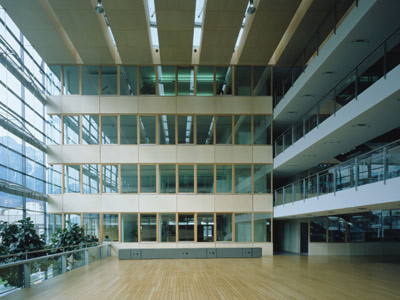 Das ist eine Veränderung der Alltagsdramaturgie, die nicht gering zu schätzen ist. Einzelne Stege zwischen den beiden Bürotürmen stellen weitere Verbindungen zwischen bestimmten Abteilungen her. Zusätzliche, der Stabilisation der beiden Türme dienende Stahlträger laufen schräg durch den Raum. Die Glaswände, die beiderseits die Atrien nach außen abschließen, sind konstruktive Meisterwerke mit einem markanten Knick in der Mitte, der Bewegungen der Fassade abfedert.