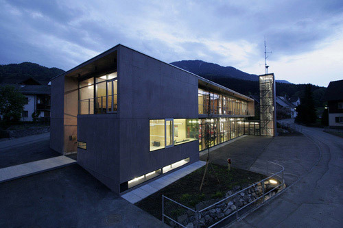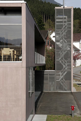 Dementsprechend einfach war die Wahl der Materialien. Sichtbeton als Baustoff strahlt schon seine Robustheit und Strapazierfähigkeit aus. Dabei legt die rötliche Färbung zwar die Assoziation zur Feuerwehr nahe, wurde aber gewählt, um das Gebäude besser in die Umgebung zu integrieren und kleiner erscheinen zu lassen. Als zweites Material tritt außen Stahl - in groben Profilen und vielfach lediglich verzinkt - in Erscheinung. Die Schränke und Möbel im Inneren sind in Esche gehalten, dem Holz, aus dem auch die Stiele vieler Werkzeuge gemacht sind. Der gesamte Werkstätten-, Einsatz- und Lagerbereich wurde bewusst „robust“ gestaltet, im Büro- und Schulungsbereich wurden die Materialien feiner behandelt und im Bereitschaftsraum wurde sogar eine gewisse „Gemütlichkeit“ angestrebt. Das Haus ist funktional einfach gegliedert. Im Erdgeschoss befinden sich der Einsatzbereich und die Werkstätten, darüber die Büros und der Schulungsbereich, darunter die Lagerräume und die Technik. (Beitrag des Architekten für die Festschrift der Feuerwehr anlässlich der Eröffnung am 20./21. 05. 2006)