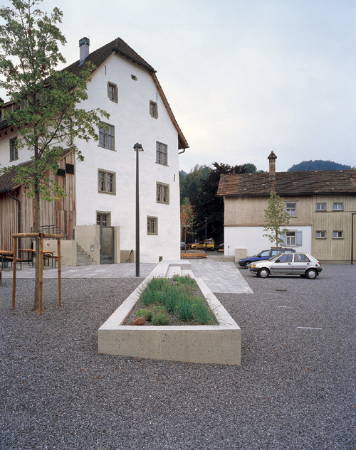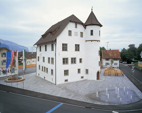 Das Anliegen der Architekten war es, das Schloss ins Zentrum zu rücken, auf den Platz zu stellen. Deshalb sollten alle Niveauunterschiede verschwinden. Es entstand eine großzügige Gesamtfläche. Der Platz ist von allen Seiten nutzbar und ohne Hindernisse begehbar. Gehsteig, Strasse und Platz bilden ein flächenbündiges Ensemble, seine Materialien sind Asphalt und heimischer Kalkstein. Die umstehenden Gebäude bilden den Rahmen für die Platzkulisse.