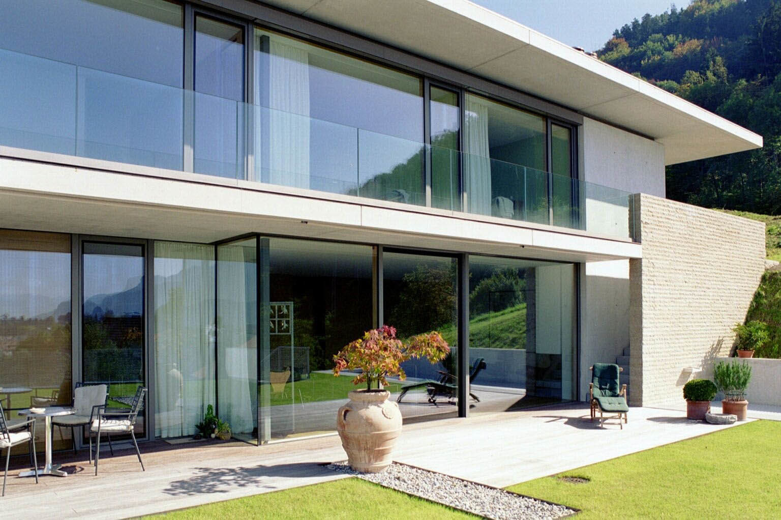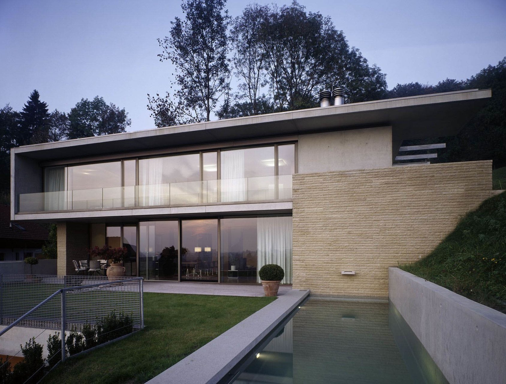 Als konstruktiver Sonnenschutz dient der ausragende Balkon des Obergeschosses. Ein schmales Schwimmbecken aus WU-Beton bildet den hangseitigen Abschluss der Terrasse. Eine Natursteinwand mit Wasserspeier trennt das Becken von der nach oben führenden Sichtbetontreppe.