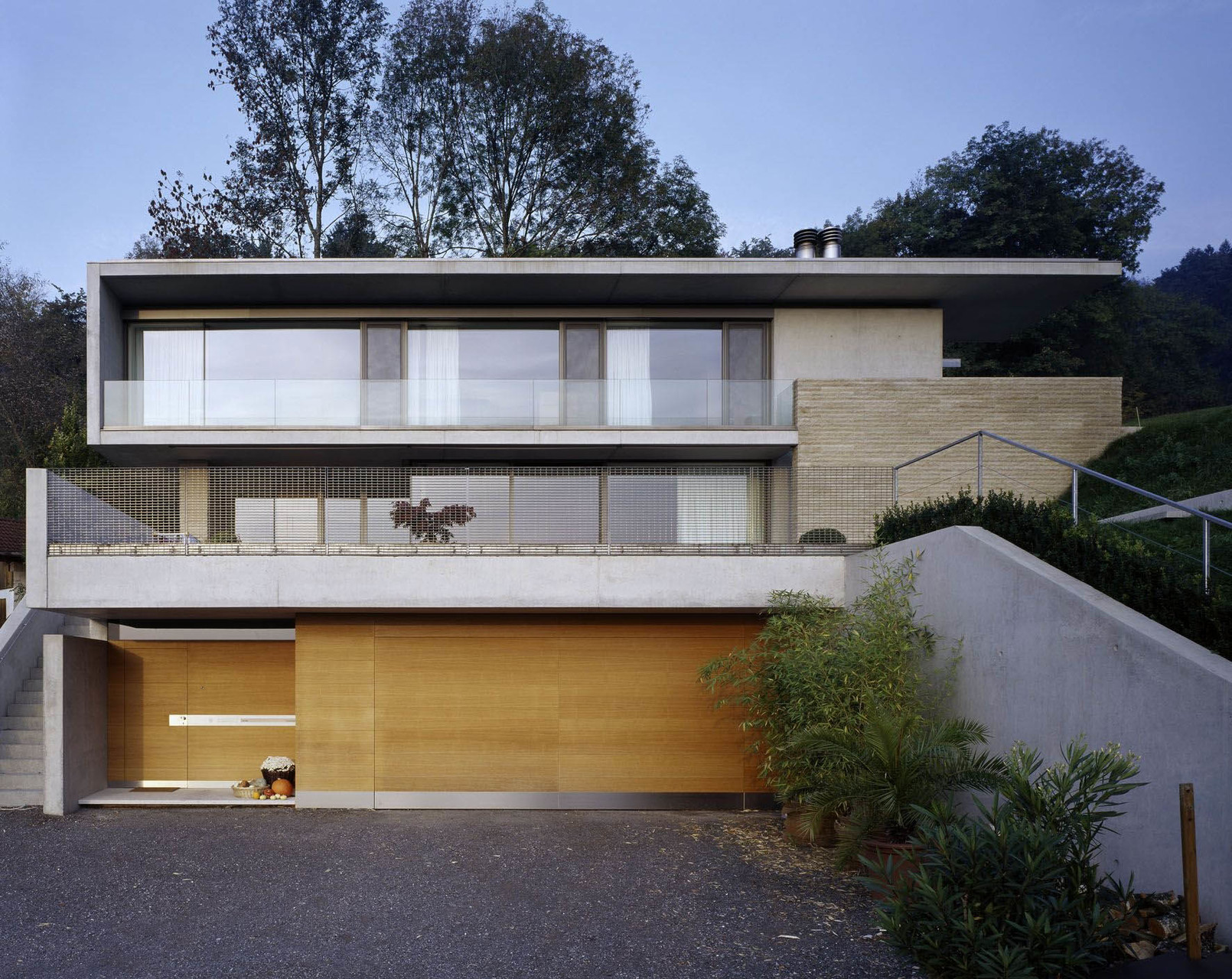 Die Detaillösung des vorspringenden Flachdachs ermöglicht eine konstruktive Beschattung der Räume im Obergeschoss. Das ausragende in der Ansicht sehr schmale Sichtbetonelement verleiht dem Haus aber auch eine elegante Note.