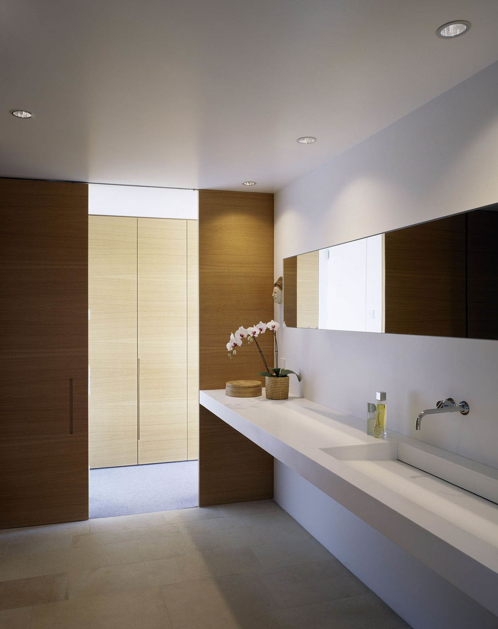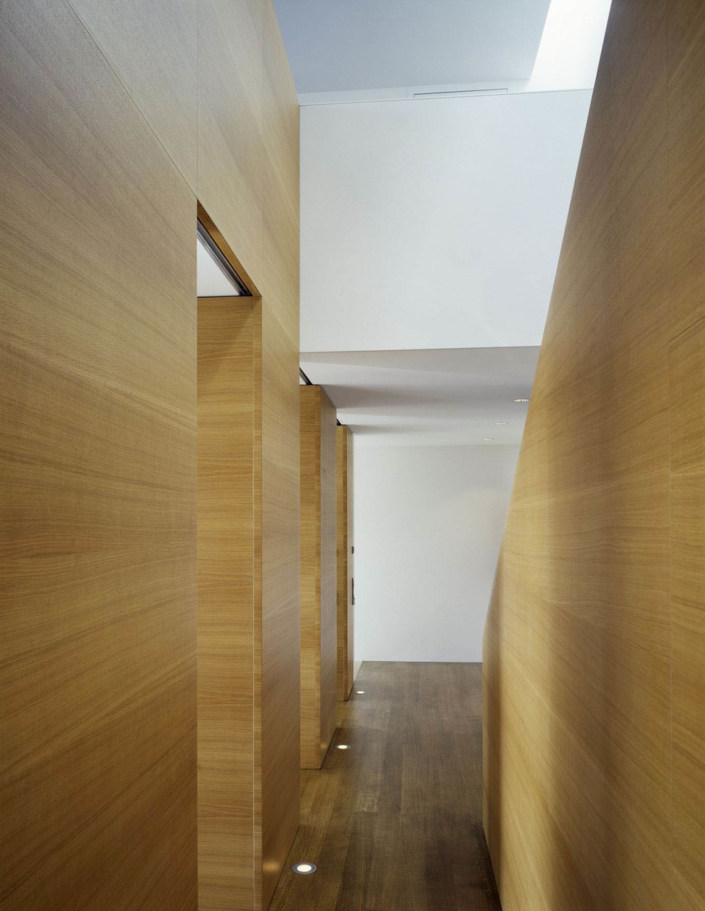 Die Wohnfläche erstreckt sich über drei Ebenen und liegt zu großen Teilen auch im Erdreich. Im Untergeschoss befindet sich neben der Garage der Eingangsbereich mit großzügiger Garderobenfläche. Schon hier sind die hochwertigen Materialien, die das gesamte Gebäude bestimmen, erkennbar. Sichtbeton, Solnhofer Naturstein und Wandverkleidungen aus Eiche werden konsequent vom Außenraum in den Innenraum geführt.