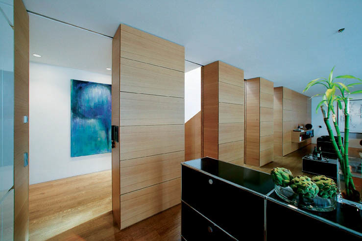 Über die einläufige Natursteintreppe gelangt man in die Hauptwohnebene. Grifflose dezente Einbauschränke dienen als Stauraum und als Trennelemente zwischen dem längs gestreckten offenen Wohn- und Kochbereich und dem Treppenraum. Ein eleganter offener Kamin und die zur Terrasse hin orientierten Glasschiebeelemente aus Randverbund-Holz-Alu-Rahmen sind weitere wesentliche Elemente, die den Wohnbereich charakterisieren.