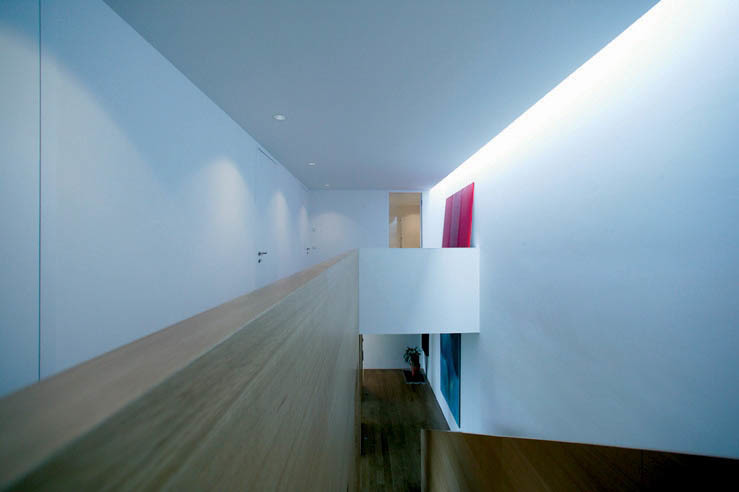 Der Treppenraum im Inneren erstreckt sich in der Höhe über zwei Ebenen. Durch einen schmalen Oberlichtglastreifen gelangt ausreichend Tageslicht auf die einläufige Treppe, die ins Obergeschoss mit den Schlaf- und Kinderzimmern und den Nasszellen führt. Der Eichenboden der Wohnebene wird pragmatisch auf Tritt- und Setzstufen weitergeführt.