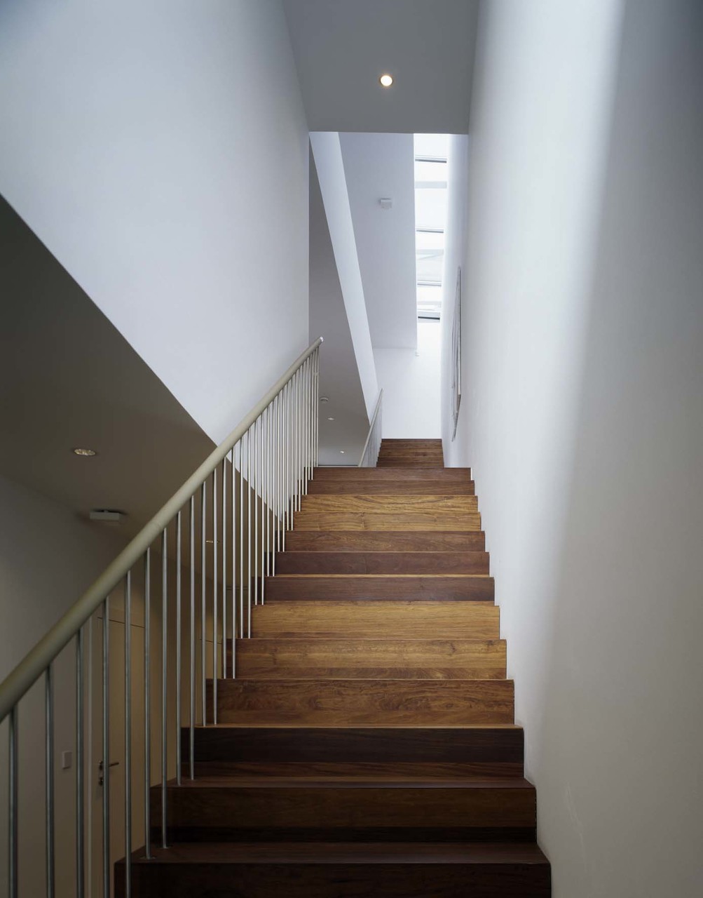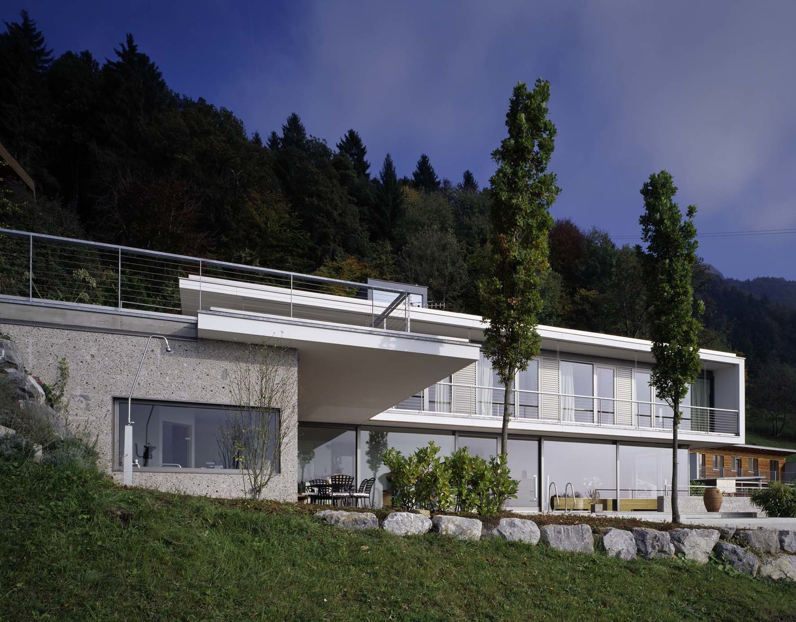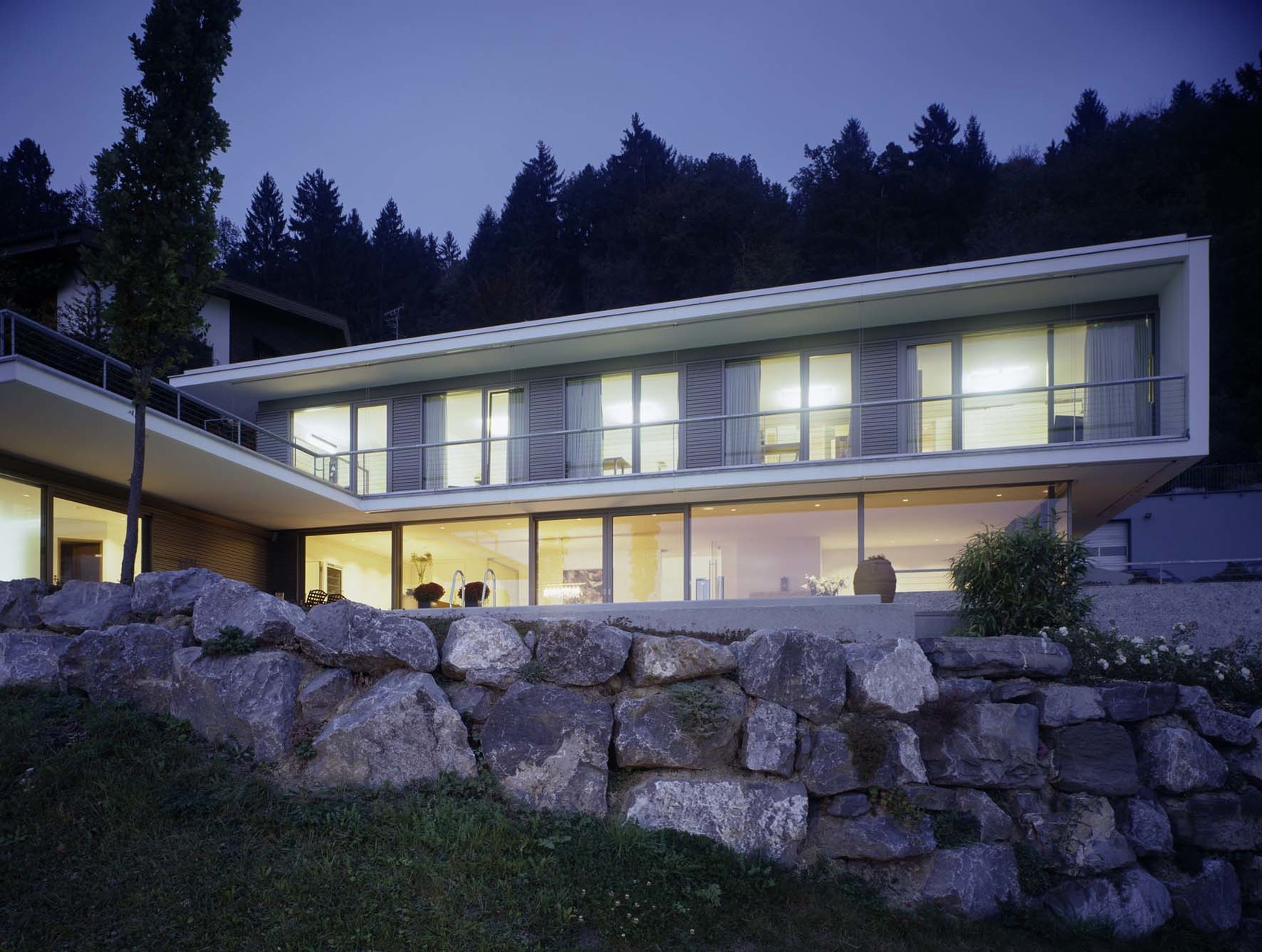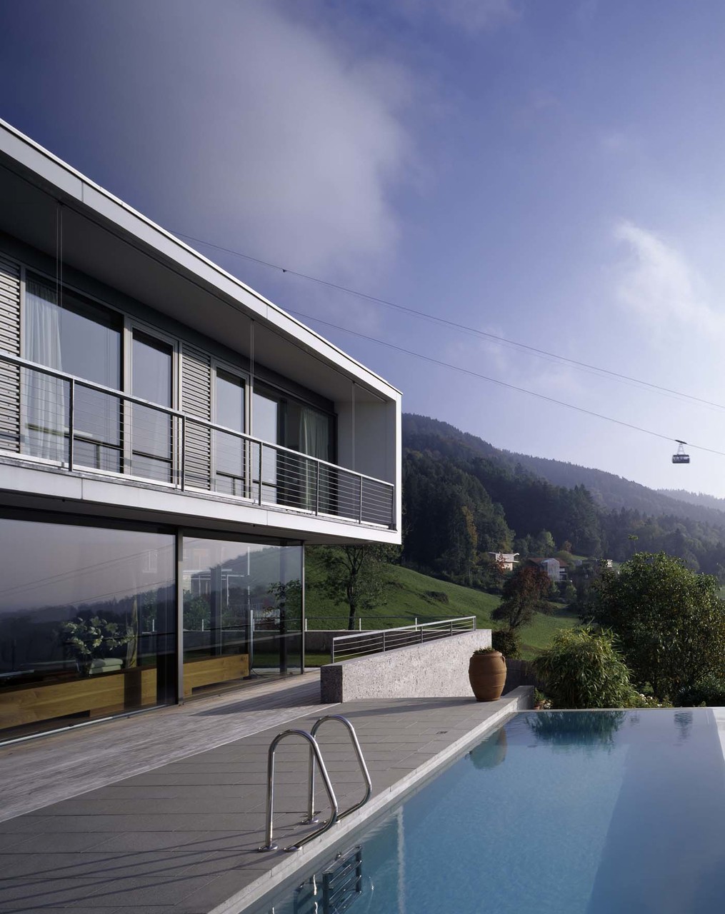 Der klare rechteckige Baukörper in starker Hangneigung öffnet sich talseitig komplett über zwei Raum hohe Glasfassaden und vermittelt den Bewohnern ganzjährig einen starken Bezug zur umgebenden Natur.
