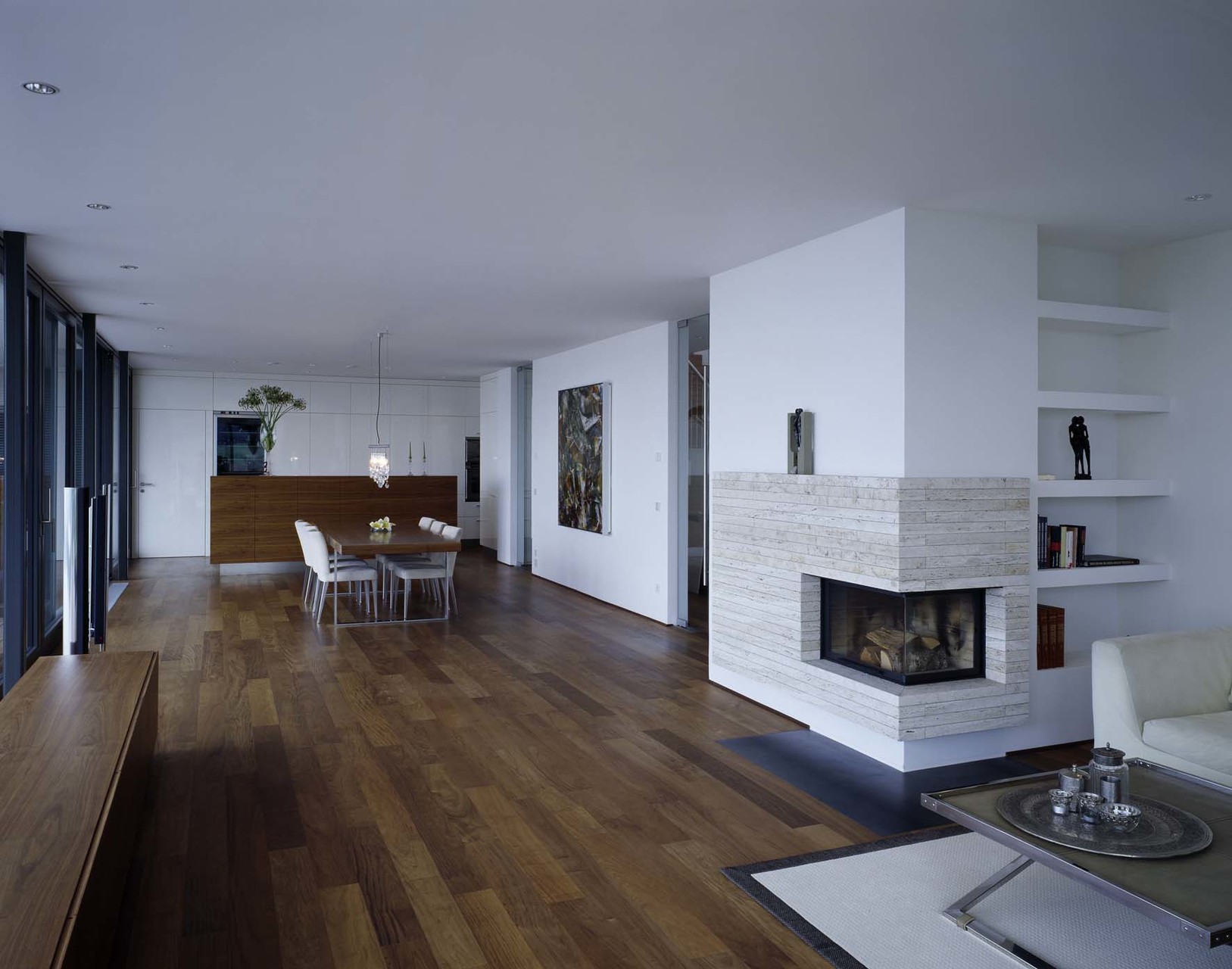 Dies drückt sich auch in der Materialwahl der Oberflächengestaltung aus: Der Eingangsbereich außen wurde aus einem Konglomeratnaturstein gestaltet, der in dieser Zusammensetzung auch am Pfänderhang anzutreffen ist. Im Inneren des Wohnhauses wurden die Fußböden und die Kaminverkleidung mit Travertin ausgeführt.