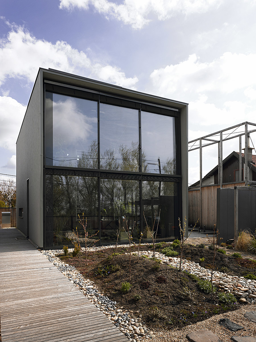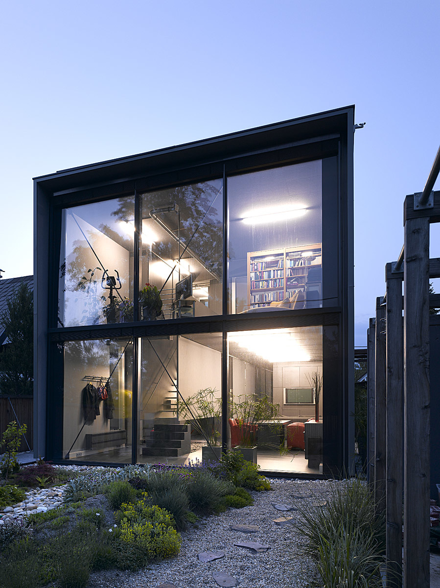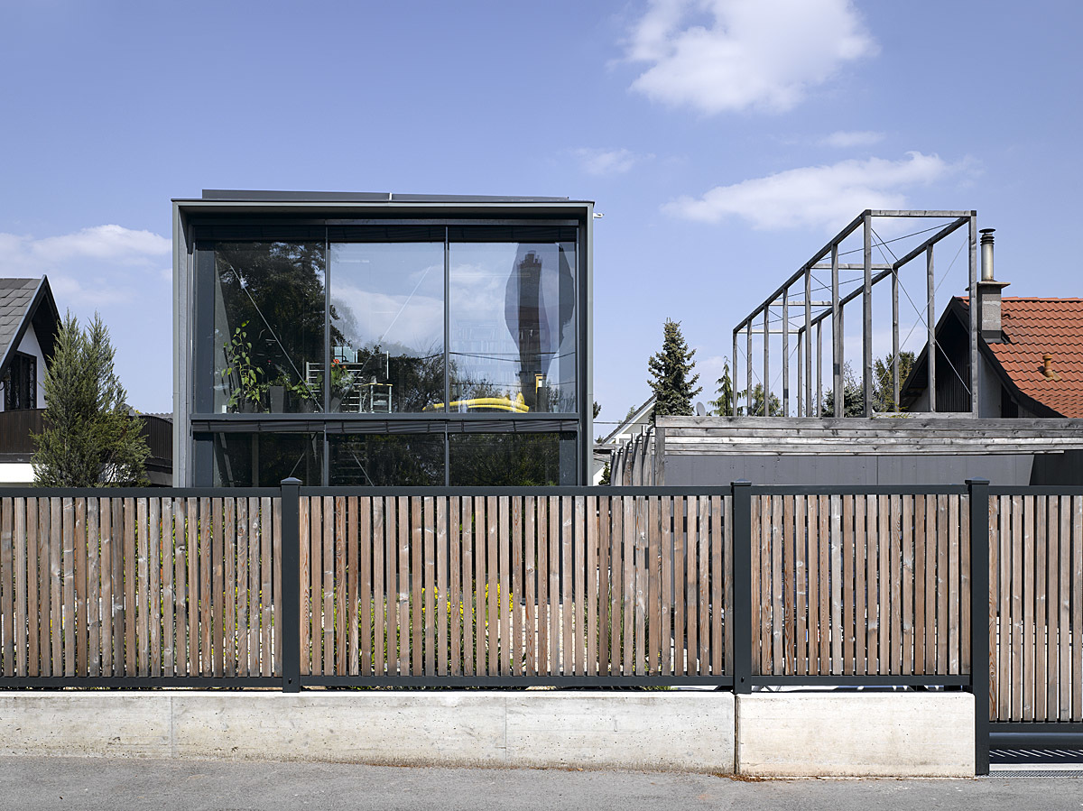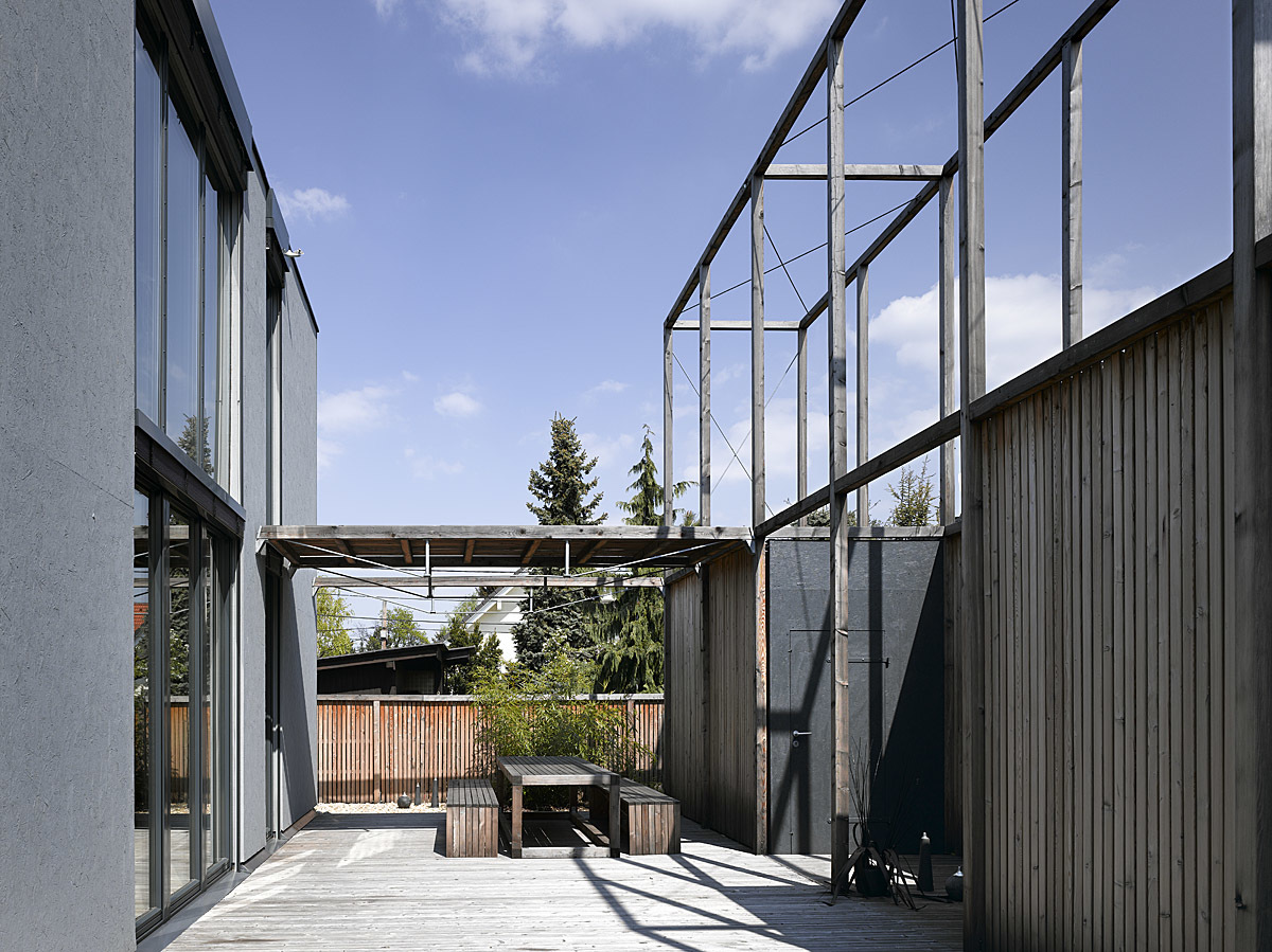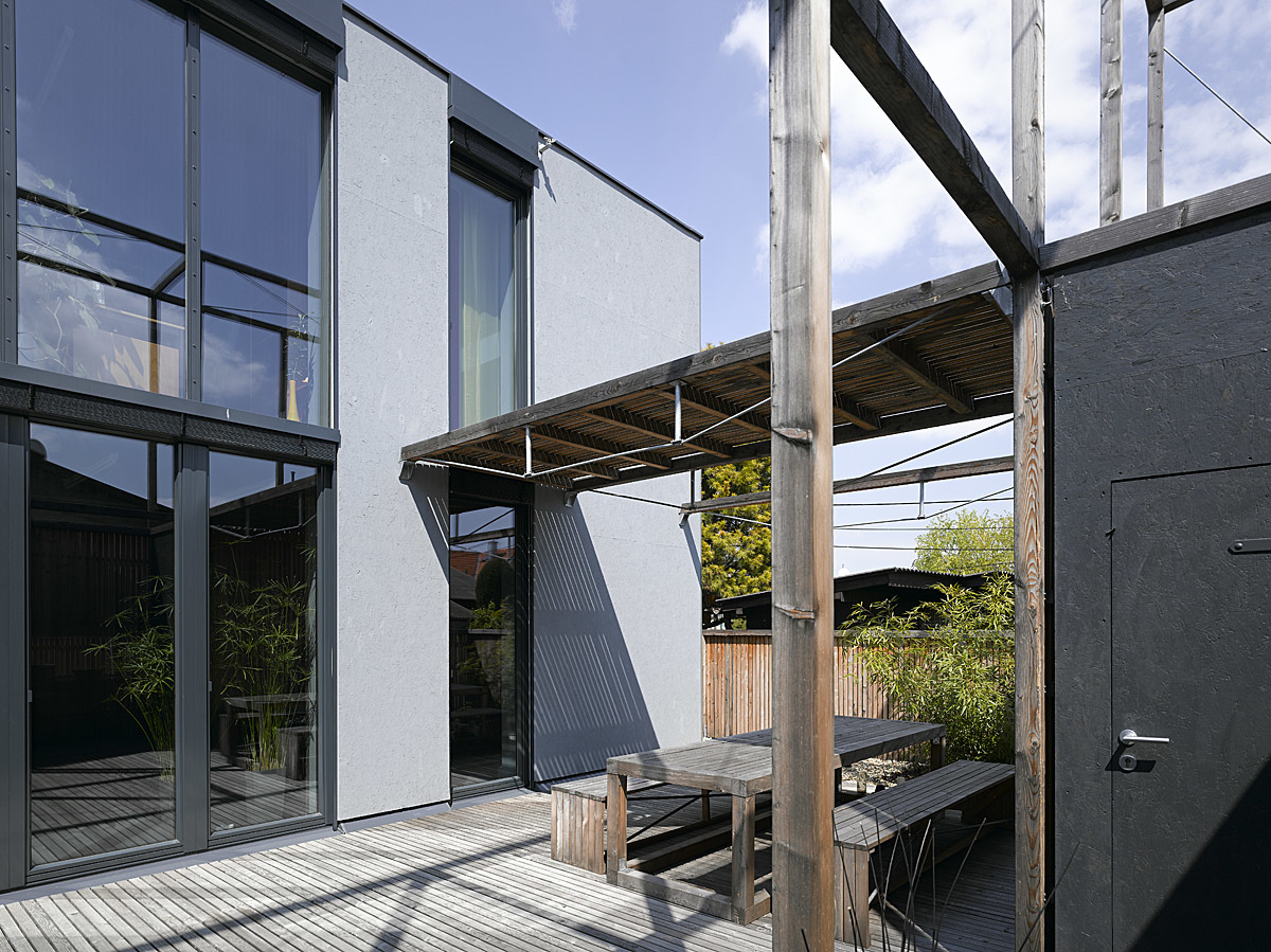 Die Bauordnung erlaubte 4,50 Meter Höhe bis zur Traufkante und 80 Quadratmeter Grundfläche. Das musste reichen für ein Wohnloft mit Küche, zwei Arbeitskojen, eine Chillout-Zone, Bad, Schlaf- und Gästezimmer. Bravourös verdichtete Moosmann das Raumprogramm zur puristischen Edelbox, deren offene Ebenen an der zweigeschoßigen Südglasfront in den Garten ausfließen. Der klare Holzleichtbau mit seinem kompakten Grundriss meistert souverän die Anforderung eines Passivhauses. Carport und Nebenraumband an der Grundgrenze schenken ihm einen intimen Hof.