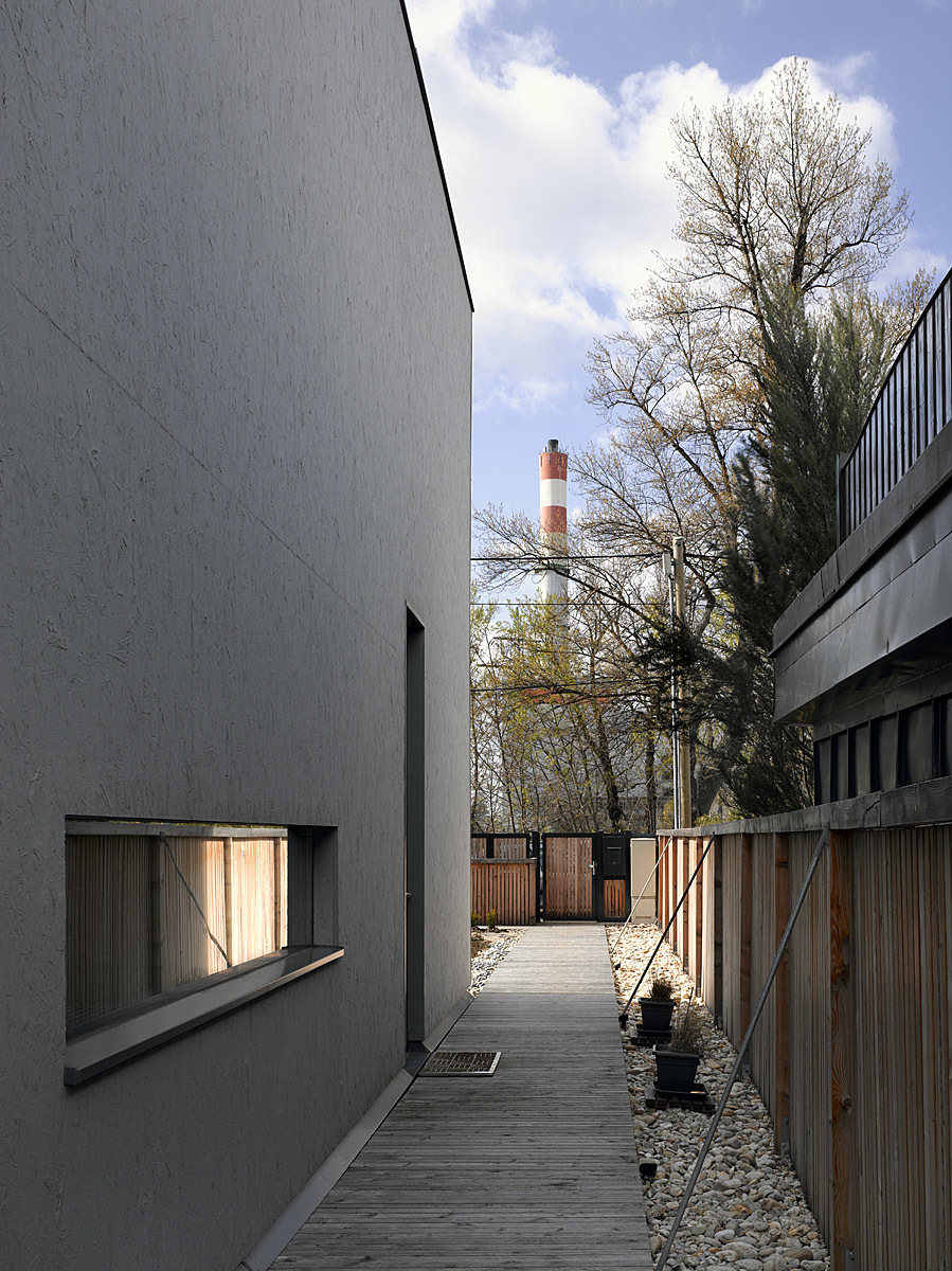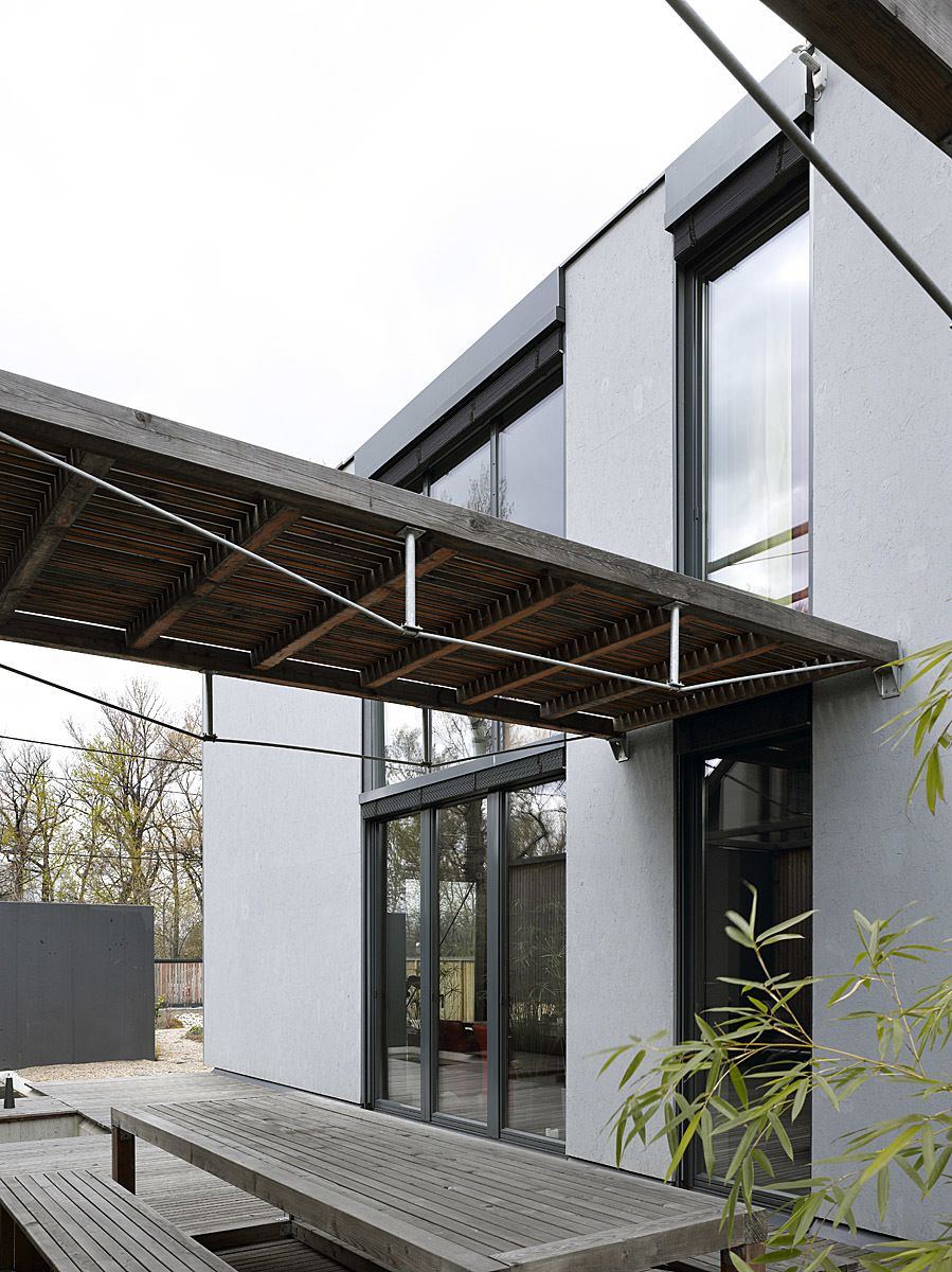Die Bauherren aber trieben weiter intensive Grund- und Architekturerkundung, entdeckten eines Tages die Passivbauweise - und das passende Grundstück: einen lauschigen Kleingarten am Schillerwasser, einem Nebenarm der Alten Donau. Im fernen Süden sieht man durch die Aulandschaft das Kraftwerk blitzen. „Hier fühlten wir uns gleich wohl, zum Kauf haben wir uns spontan entschieden“, sagt die Bauherrin. Dann bekam Architekt Moosmann einen Anruf: Die japanische High-Tech-Box solle ein kosten- und energiesparendes Passivhaus werden.