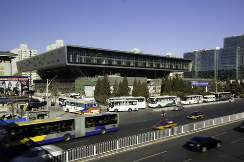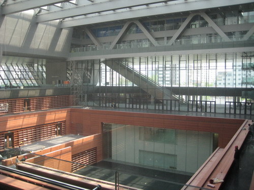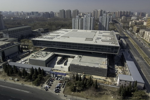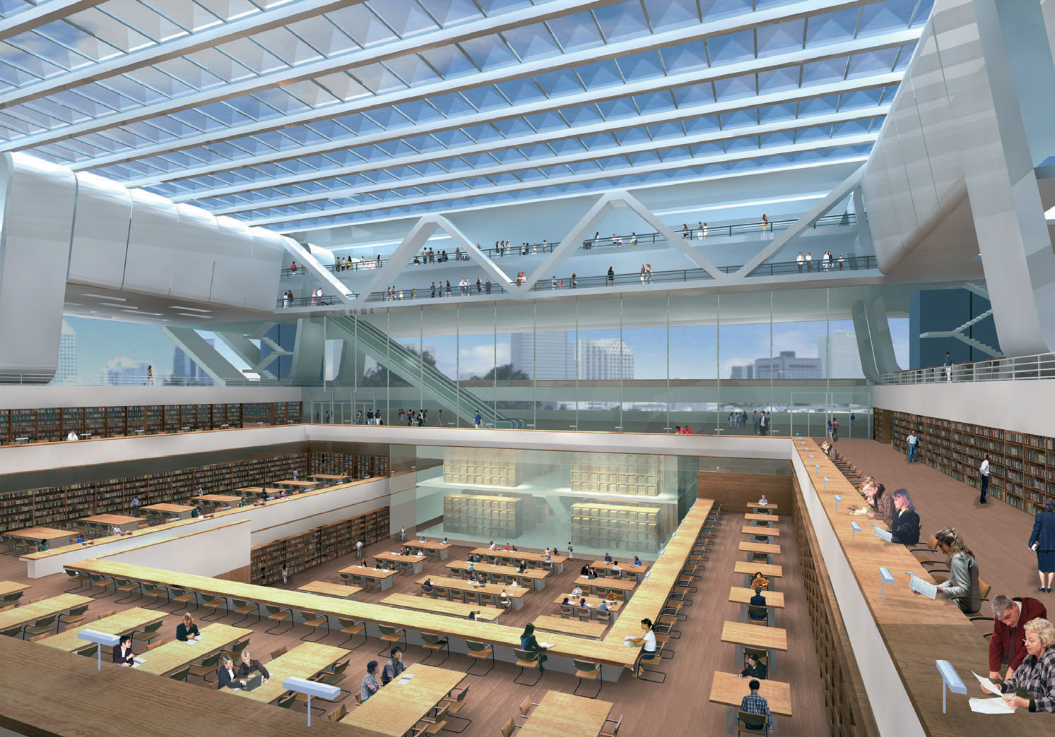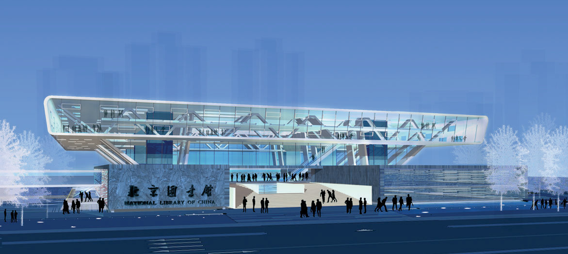 Der Entwurf ist aus einem internationalen Wettbewerb mit neun ausgewählten Teilnehmern als Sieger hervorgegangen. Ein zweiter Bauabschnitt mit einer Fläche von 77.000 Quadratmetern für circa 12 Millionen Bücher erweitert die Nationalbibliothek, die stündlich 12.000 Besucher hat. Ihr größter Schatz sind die Aufzeichnungen von »Si Ku Quan Shu« des Kaisers Quianlong (1736-1795), der von allen historischen Schriften der chinesischen Kultur Abschriften herstellen ließ. Der Entwurf baut auf dieser Sammlung auf, sie ist im Sockel des Gebäudes untergebracht. Um diese herum liegt auf mehreren Ebenen – archäologischen Schichten der Kultur entlehnt – der große Raum der eigentlichen zeitgenössischen Bibliothek mit Lesesälen, Handapparaten und Präsenzbibliothek. Darüber, im »schwebenden« Dach, ist die digitale Bibliothek zu finden, Synonym für die weltweite Vernetzung. Der Neubau verknüpft so symbolisch Vergangenheit, Gegenwart und Zukunft, die aufeinander aufbauen. Der 90 mal 119 Meter große Gebäudekomplex, dessen Sockel fünf Geschosse tief in die Erde reicht, ist horizontal gegliedert und erschlossen. Der Eingang führt über eine breite Freitreppe in die zweite Etage. Von hier überblickt man die gesamte Bibliothek mit der weit gespannten Stahlkonstruktion des Dachs. Die Ebenen gehen ineinander über, Buchreihen wechseln mit Leseplätzen, Treppen und Rolltreppen erschließen die Geschosse. Die große gläserne Rückwand verbindet den Innenraum mit der Außenwelt und erleichtert die Orientierung.