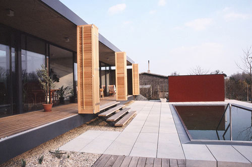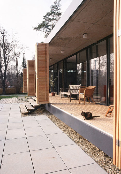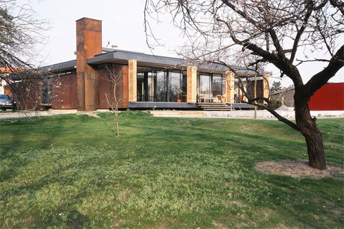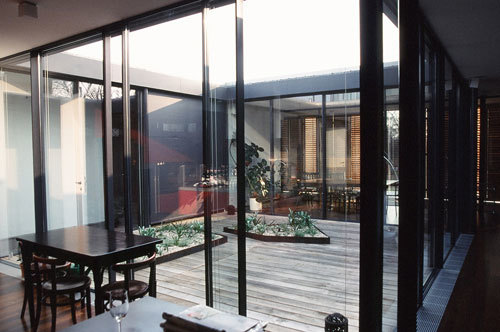 Das ebenerdige, d.h. teilunterkellerte Atriumhaus (Konstruktion: Stahlbeton, Stahlsäulen, Cortenstahlfassade) mit gläsernem Dachpavillon wirkt nach außen, vor allem zur umliegenden kleinteiligen Bebauung verschlossen, doch zum Garten und zum dahinterliegenden Wasserarm öffnet es sich mit großflächiger Verglasung und einer der gesamten Front vorgelagerten Veranda, die sich mit faltbaren Holzläden individuell öffnen oder abschließen lässt. Die Grenze zwischen Innen- und Außenraum ist damit zur wohnlichen Raumschicht geweitet, die viele Nuancen der Öffnung oder Abgrenzung ermöglicht. Lichtbringendes Herzstück des Hauses ist ein mit zwei Kiesinseln gestaltetes Atrium, das die Witterung und den Wechsel der Jahreszeiten auch „vom Sofa aus“ intensiv erlebbar macht. Die Fassade aus rostendem Stahlblech verleiht dem Gebäude eine anmutige Herbheit – in dieser Gegend der Stadt eine durchaus angemessene Geste. (Text: Gabriele Kaiser)