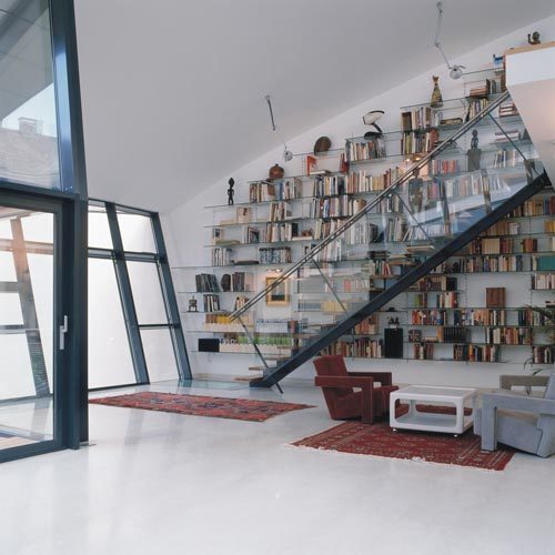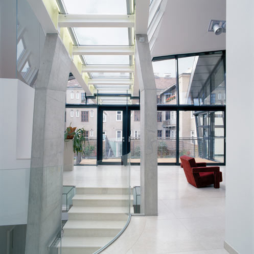 Zur Straße gibt sich der Dachaufbau dezent und streng diszipliniert. Die Kastenfenster blieben, die bestehende Fassade wurde in einheitliches Weiß getaucht. Vorwitzig lugt darüber die Bibliotheksgalerie über das minimalistische Gesims. Der hofseitige Formenausbruch lässt sich von dieser Seite bestenfalls erahnen. Expressiv bricht das Dachgeschoß in vollverglaster Freiform über dem Garten aus. Von der edelstahlgedeckten Kugelkalotte überm offenen Raum bis zur Regenrinne am Schrägprofil ist jedes Detail der neuen Dachskulptur akribisch durchdacht. „Sanierung und Dachausbau eines solchen Hauses sind eine dreidimensionale Werbung“, sagt Liaunig, „da kann man zeigen, wozu man imstande ist.“