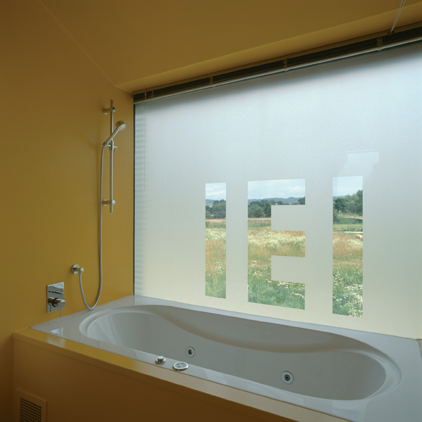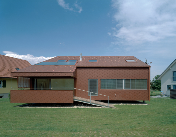 Satteldach, Aufständerung (die Rohdeckenoberkante liegt 15 cm über dem 100jährigen Hochwasserpegel) sowie der Splitlevel führen zu einer markanten Umrisslinie, die durch die monochrome Haut aus Eternitplatten zusätzlich gestärkt wird. Diese Haut lässt auch die konstruktiven Bereiche Dach, Wand und Boden zu einer Einheit verschmelzen. Durch das Satteldach verbindet sich das Objekt mit seiner Umgebung, die Körperhaftigkeit und das Schweben über dem Boden lassen das Gebäude gleichzeitig eigenständig und temporär, beinahe ortlos wirken.
