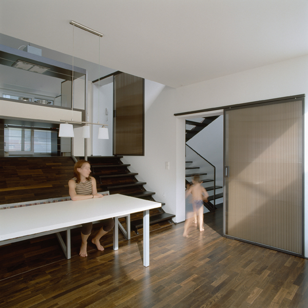 Im Fall der Casa D führte diese Adaptierung zu einer Neuinterpretation des Archetypus Satteldachhaus, innenräumlich zu einer funktionalen Gliederung in Auto-, Gemeinschafts-, Kinder-, Eltern- und Chill-out-Bereich.