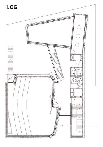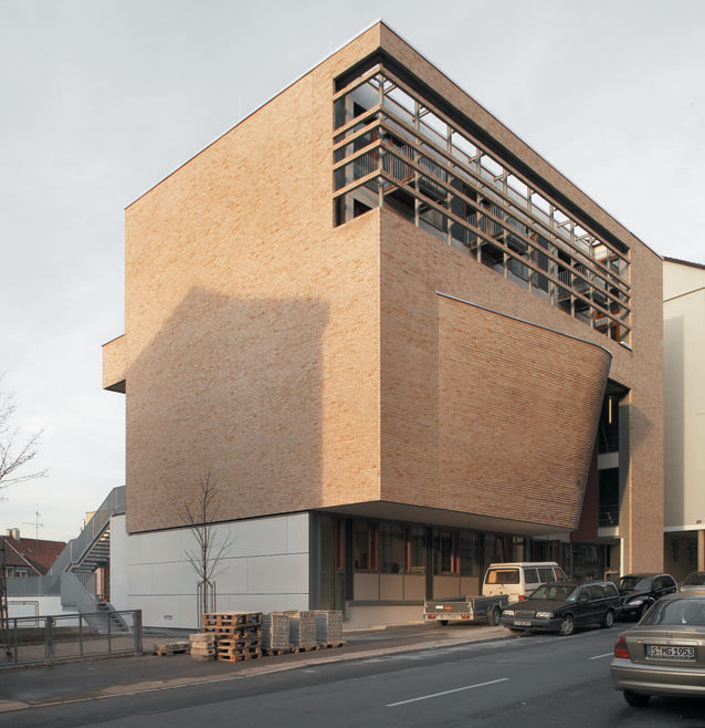 The location is central, on a sloping site typical of Stuttgart. The plot, on a slightly inclined street, is surrounded by five- and six-storey buildings, some dating from the turn of the last century. The direct proximity of post-war developments has given the new choir school a harmonizing function. The street features a relatively consistent use of brickwork and natural stone – and this material theme was taken up by the young architects no w here in their design. Instead of a hierarchy of front, side and rear views, they chose to present the building as a sculptural volume, but without overwhelming the rest of the street. The foyer, large rehearsal hall, small practice rooms, library and even a small number of apartments are clad in a skin of bricks whose non-load-bearing quality is highlighted by the architects in the curved façade. The tone of the bricks from East Frisia is an excellent match with the surroundings, and mortar of a similar pale shade was used. Ten per cent of the bricks have been laid with their darker, reverse side outwards, enlivening the large surface. In places where daylight is intended to enter the building over more than one storey, the facade is curved, breached or folded. Behind the horizontal bands of brick in the upper floors lie the covered walkways giving access to the apartments. In addition, a variety of materials – wood, steel, stucco, fair-faced concrete – ensures that the brickwork does not become tedious.