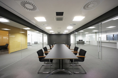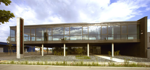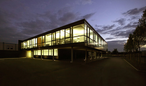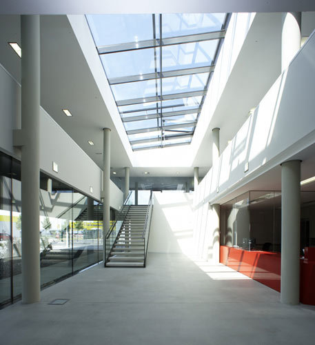 Ein breiter uneingefriedeter Vorgarten bildet einen japanisch anmutenden Steingrund, der Verwaltungs- und Lagergebäude zur Einheit fasst. Durch seinen auf drei Seiten weit zurückgesetzten Sockel schwebt der raumhoch verglaste Büropavillon scheinbar über dem Boden und bietet einen gedeckten Zugang von den Parkplätzen. Die Dachflächenverglasung über der zentralen Empfangshalle erhellt die ohnehin lichte Gebäudemitte zusätzlich auf. Eine offene Treppe führt ins Obergeschoss, wo der Kranz der glasreichen Büroräume Übersicht gewährt, aber auch dank innenliegender Jalousien Abschottungsmöglichkeiten bietet. Die überbreite Bürstung der Galerie zur Halle eignet sich als informelles Pult für kurze Besprechungen „zwischen Tür und Angel“. Die Materialien und Oberflächen folgen einem reduktionistischen Hell-Dunkel-Kontrast, nur in den hochglanzlackierten Einbauten blitzt gelegentlich die Logofarbe Rot hervor. (Text: Gabriele Kaiser)