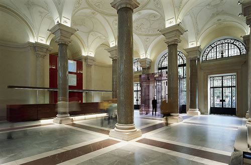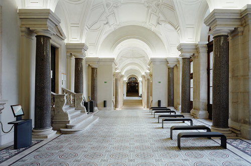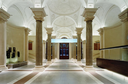 Zahlreiche Seitenstiegen führen die Studierenden von den Hörsälen hinunter in den Arkadenhof. Spots beleuchten die Kreuzungspunkte von innen und außen. Die Arkaden des gesamten Hofes sind einsehbar, Lichtpunkte bilden abends eine stimmige Kulisse, die Friedhofsstimmung entlang der Büsten in den Arkaden ist Geschichte. (Text: Martina Frühwirth)