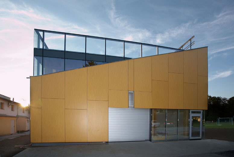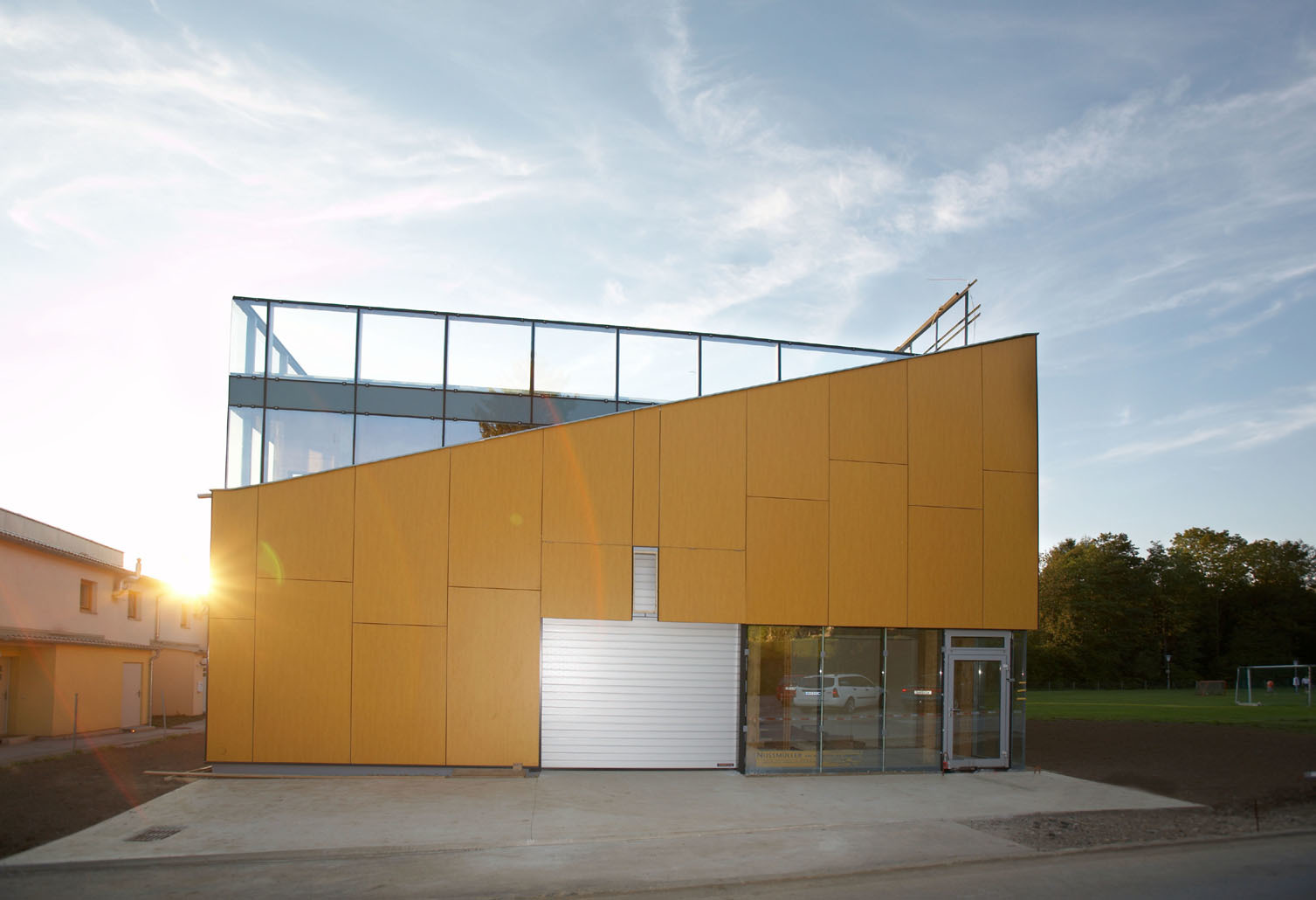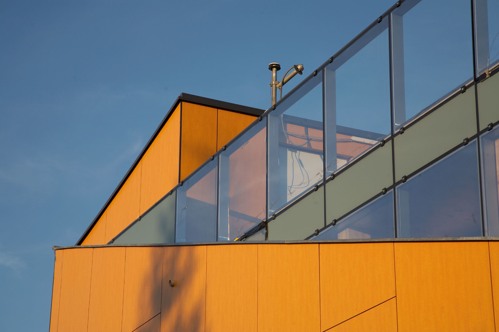 Der Baukörper versucht einerseits die Formensprache der Nachbarbebauung auf abstrakte Weise weiterzuführen, andererseits wurde sie von Bauauflagen bestimmt wie der vorgeschriebene Sichtschutz der Dachterrasse zum Wellenbad. Das daraus entstehende Gebäudevolumen erweckt den Eindruck von zwei ineinander geschobenen Boxen: die eine aus Glas, die andere nach oben abgeschrägt. Südseitig bleibt so Platz für eine großzügige Belichtung des Innenraums. Auf der Nordseite, wo die Fassade das begehbare Dach überragt, sorgt diese so für den Sichtschutz hin zum Freibad.
