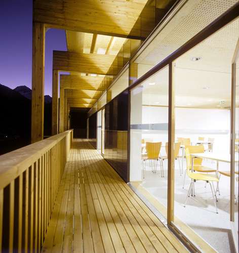 Eine Stahlbetonkonstruktion wurde als Hangstützung in den Hang gesetzt und trägt die Holzkonstruktion aus Lärchenholz, die aus zwei Teilen besteht: Der Dachkonstruktion aus Stützen und Leimbindern, die eine begrünte Dachplatte tragen und der darunter gehängten gedämmten Deckenplatte. Durch die Trennung der Primärkonstruktion von der Gebäudehülle werden Kältebrücken minimiert und durch das Vorbeiführen der Wandkonstruktion an der Stahlbetondecke problematische Geschosstrennfugen vermieden. Die Außenhaut besteht aus einer einfachen Lärchenholzverschalung mit stehenden Brettern und einer gut geschützten Plattenfassade aus mit Schiffslack überzogenen OSB-Platten, die als grünblau schimmernder Gebäudekern im Kontrast zur verwitternden Holzstruktur von Außenhaut und Primärkonstruktion das Erscheinungsbild dieses Seminargebäudes prägen.