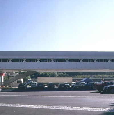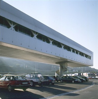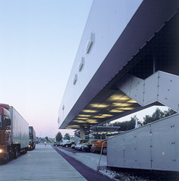 Die zuerst errichtete Veterinärstation hat ein Stahlfachwerk mit unterschiedlichen Wandpaneelen entsprechend den Funktionsbereichen. Dach und Wände sind außen fugenlos mit hochfester Folie überzogen, mit Stahlseilen nach unten abgespannt. Ohne Attikadetails und Dachrinnen konnte durch diese Innovation der Fassadenpreis auf ein Drittel des Üblichen gesenkt werden. Am Vordach der Rampe ist die Haut über die Unterseite zurückgespannt: mit integrierten Leuchten wird die Auskragung nachts zum Lichtkörper. Der Verwaltungstrakt gegenüber ist als Brücke ausgebildet, unter der ein gedeckter LKW-Park- und Abfertigungsplatz mit offener Kommunikation zum adaptierten Altbau entstand. Das Stahlfachwerk hat als Klimahülle Holz-Sandwichelemente. Auch hier ist als Außenhaut die weiße Folie über alles gespannt, der Regen aber über Innenentwässerung abgeleitet. (Text: Otto Kapfinger)