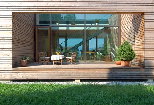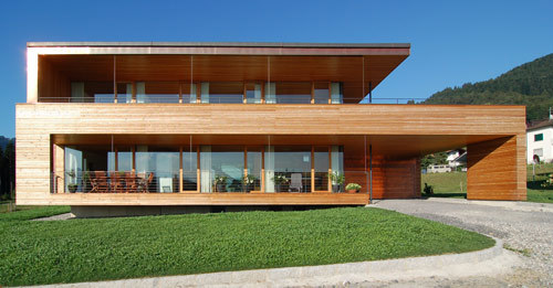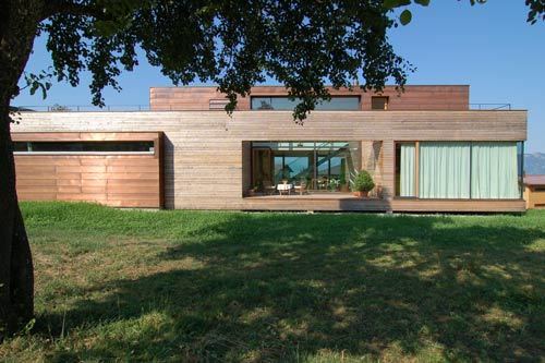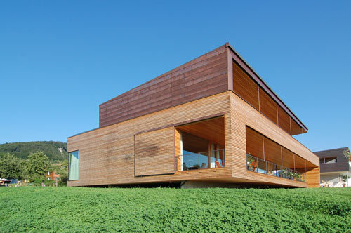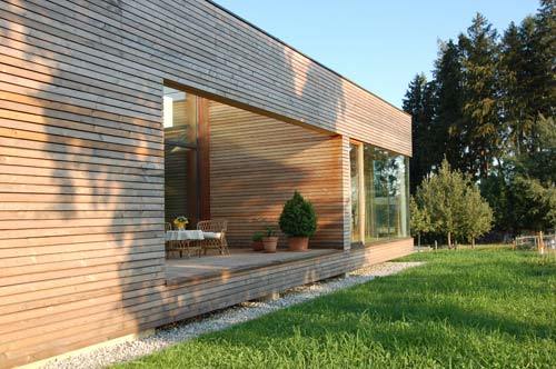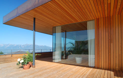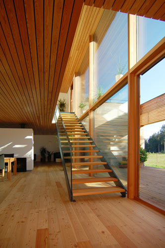 Im Obergeschoß dominieren ebenfalls große Terrassenflächen. Sämtliche Schlafräume und das Badezimmer sind zur Terrasse raumhoch verglast und haben einen direkten Zugang auf die blickgeschützte und teilweise überdachte Terrasse im Obergeschoß mit Ausblick in die gesamte Landschaft. Aus gesundheitlichen und ökologischen Gründen wurde auf synthetische Holzschutzmittel und Lacke verzichtet. Alle verwendeten Materialien sind naturbelassen. Auch hohe gestalterische und statische Anforderungen zeigen, dass sie überzeugend im Einklang mit ökologischen, gesundheits- und umweltverträglichen sowie wiederverwendbare Baustoffen realisiert werden können. Wärmepumpe, Holzofen, und die Wärmeschutzverglasung sorgen für einen Energiebedarf von 40 KWh/m² pro Jahr. (Text: Architekt)