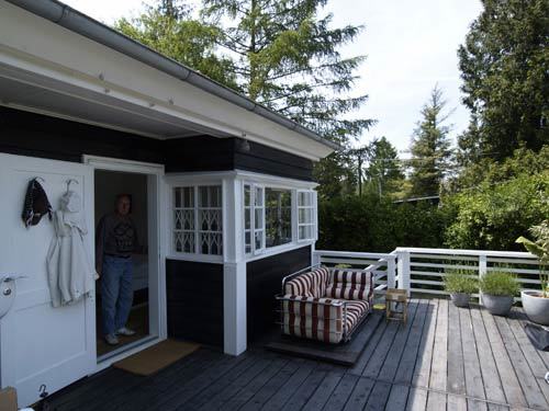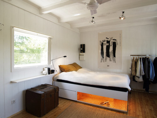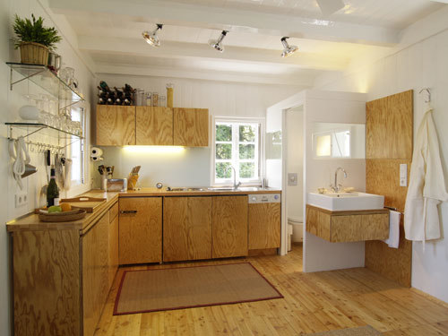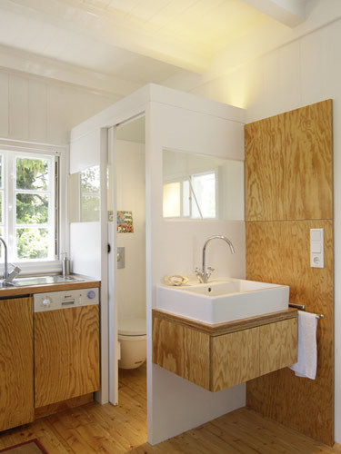 Um das kleine Gebäude den Bedürfnissen heutiger Nutzung anzupassen, wurde deephaus nicht nur mit der umfassenden Bestandssanierung beauftragt, sondern auch mit einer innenräumlichen Adaptierung. Verschiedenste Nutzungen - vom Schlafraum, über Bad und WC, Esszimmer bis hin zum Arbeits- und Stauraum - sollten auf 18 m² idealerweise so organisiert werden, dass inmitten der Funktionsverdichtung auf kleiner Fläche auch noch ein Gefühl von Großzügigkeit aufkommen kann. Im hellen Kontrast der weißen Wände und der Möblierung aus Weichholz erscheint der multifunktionale Einraum als Einheit mit Erweiterungsmöglichkeiten ins Freie. Denn wo lässt sich ein lauer Sommerabend besser genießen als im Freiluftwohnzimmer vor dem Haus? (Text: Gabriele Kaiser)