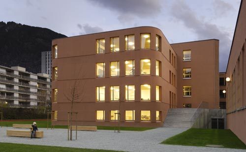 Der Siegerentwurf von Claudia Drilling aus Trin und Adrian Christen aus Chur setzt an der Nahtstelle zwischen den beiden Schulgebäuden an. Der Neubau sollte so gesetzt werden, dass das bestehende Gefüge nicht gestört, sondern logisch erweitert wird. Der gewählte Standort zwischen den bestehenden Schulteilen hat nicht nur betriebliche Vorteile, da der Neubau so zum Verbindungsglied werden konnte. Auch die eingewachsenen Grünräume der Aussenanlage im Osten, Süden und Westen blieben erhalten, und die weite Öffnung des zentralen Pausenhofes nach Süden wurde so nicht gestört. Mit dem Neubau konkurrenzieren die Architekten den bestehenden Schulbau nicht, sondern ergänzen die gestufte Kubatur um ein Element. Die Erweiterung planten sie nicht auf dem Niveau des Altbaus, sondern um ein halbes Geschoss nach