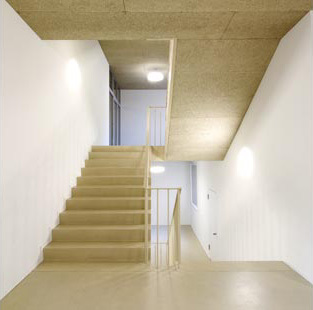 Auf allen Ebenen setzten die Architekten auf ein einfaches, die Räume optisch miteinander verbindendes Farbkonzept: Sie verwendeten beige eingefärbten und geölten Fliessestrich als Boden für die Erschliessungsräume und naturbelassene, also beigefarbene, doppelformatige Faserzementplatten an den Decken. Dazwischen verlaufen die weiss gestrichenen Wände und Türen als durchgehendes Band. In den Schulzimmern und der Schulküche wurde ein farblich abgestimmter, aber günstigerer Linoleumboden verlegt. Nur in der Werkstatt setzten die Architekten auch den langlebigen Zementestrich ein, um der höheren Beanspruchung Rechnung zu tragen.